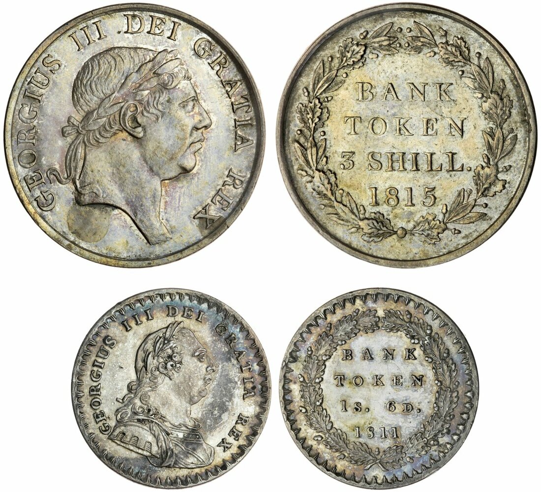 The Hardcastle Collection | George III, Bank of England, Tokens (2), Three-Shillings, 1815, second laureate head, rev. open wreath, 16 acorns and 16 berries (Bull B²/3; ESC 2084 [423]; Davis 59; S.3770), once cleaned, now retoning, a bolder very fine; also Eighteen-Pence, 1811, first laureate, draped and cuirassed bust right, rev. small lettered, similar to last (Bull A³/2; ESC 2112 [969]; Davis 61; S.3771), some surface marks and irregular tone, otherwise almost extremely fine (2)