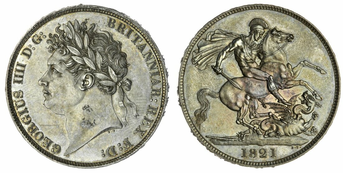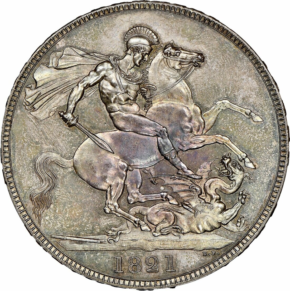 The Hardcastle Collection | MINT STATE 62 | George IV (1820-30), Crown, 1821 SECUNDO, laureate head left, rev. St George and dragon, WWP under broken lance (ESC 2310 [246]; S.2805), a beautiful example with attractive proof-like bloom, in the cataloguer's view undergraded, in NGC holder, graded MS62 (Cert. #5878622-017) [Tied 1 of 37 / 53 Finer]