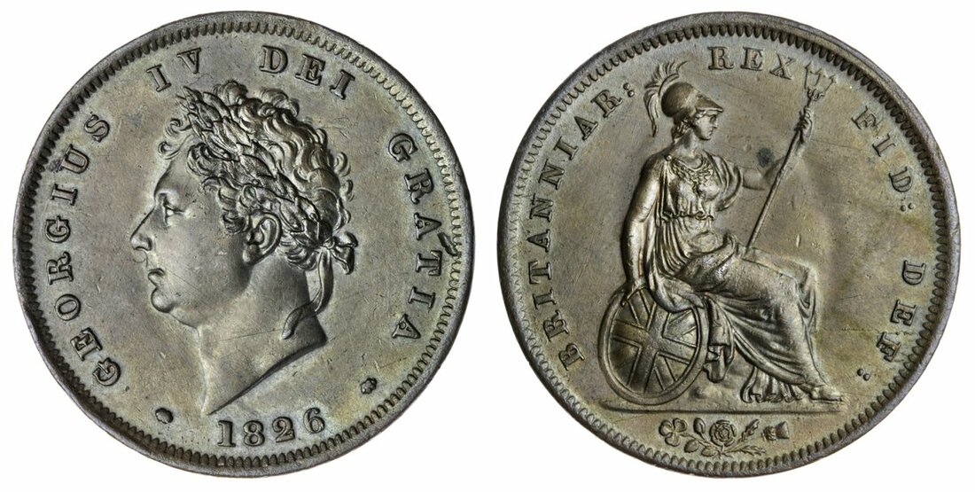 The Hardcastle Collection | George IV (1820-30), Penny, 1826, laureate head left, rev. Britannia seated right, shield with two incuse lines, edge plain, 12h (Peck 1422; S.3823), very fine, nick at obverse rim at 3 o'clock, spot on reverse