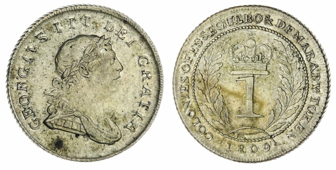 The Hardcastle Collection | British Guiana, Essequibo and Demerary, George III (1760-1820), Guilder 1809 (Pridmore 10; KM 6), near extremely fine and residually lustrous, scarce thus