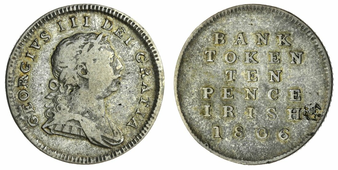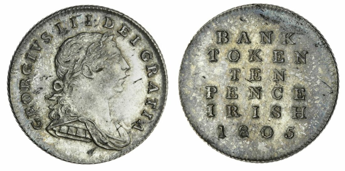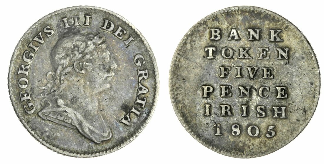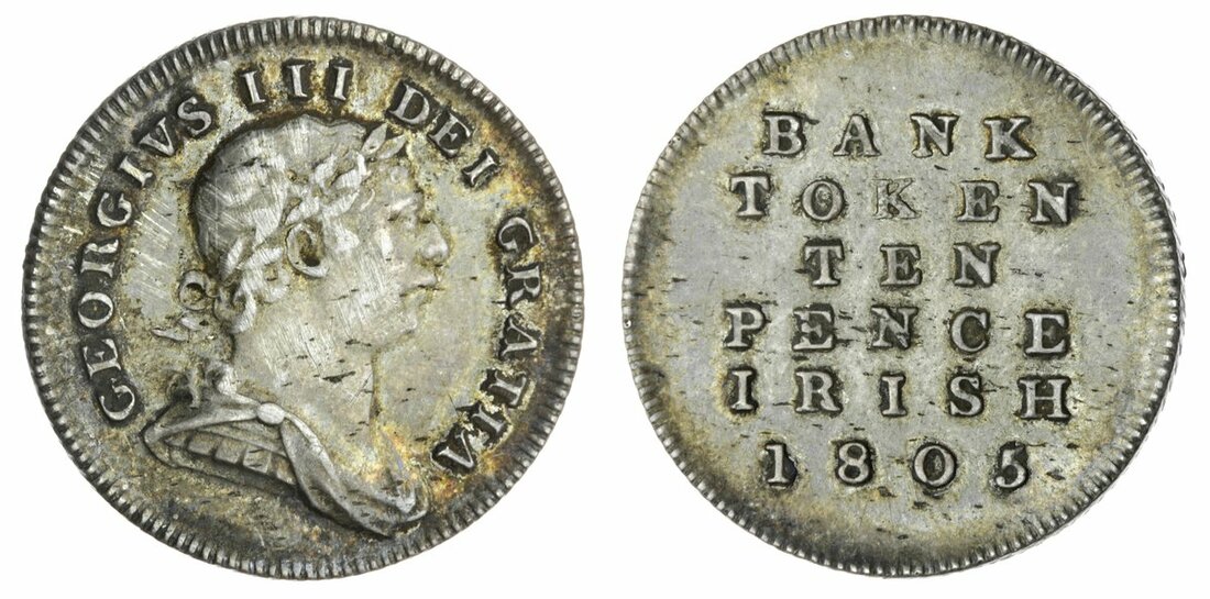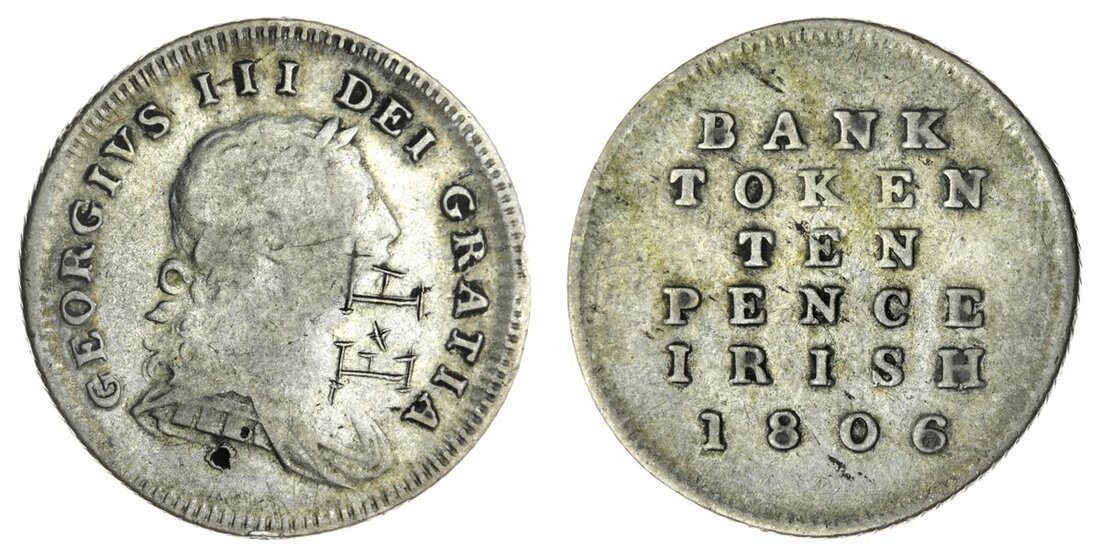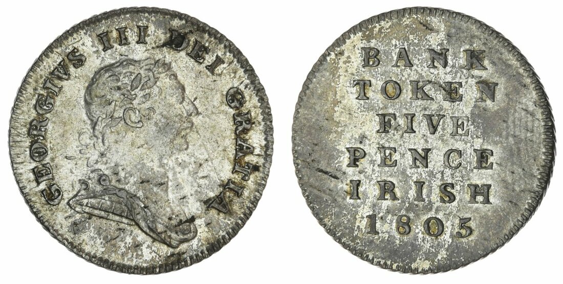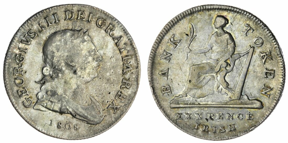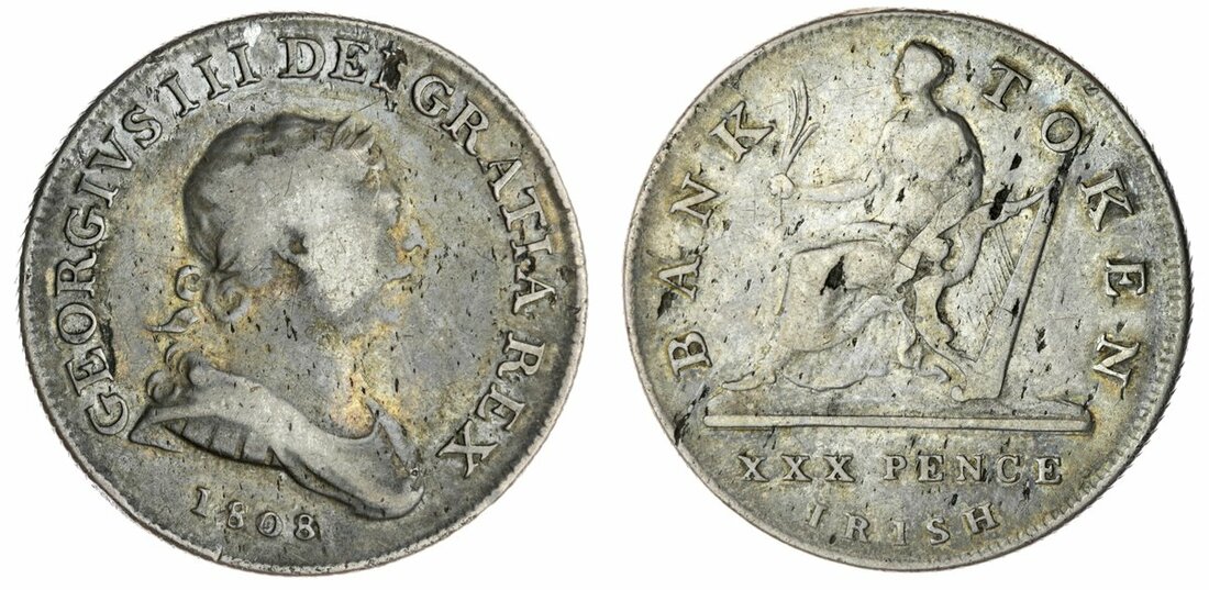 The Hardcastle Collection | Ireland, George III, Bank of Ireland (1760-1820), Bank Tokens (9), including, Thirty-Pences, 1808 (2) (S.6616, 6616A), fair to fine; Tenpences 1805 (2); and, 1806 (2) (S.6617), one of the 1805s choice about mint state, the others fair to fine, one with graffiti; lastly, Fivepences, 1805 (2); 1806 (S.6619), the 1806 creased, poor, one 1805 fine, the other lustrous, near extremely fine(9)
