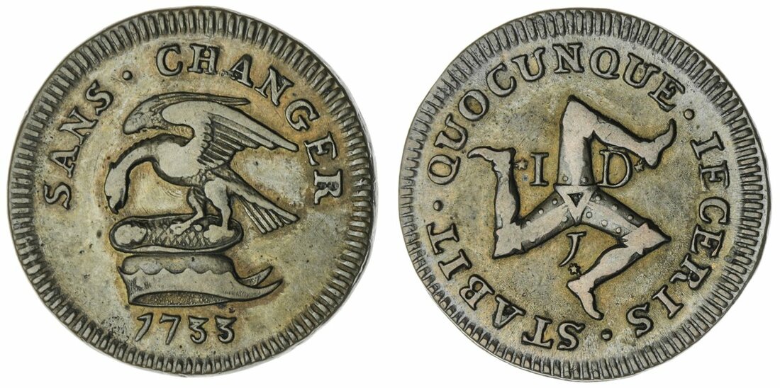 The Hardcastle Collection | Isle of Man, James Stanley, 10th Earl of Derby, Penny, 1733, second issue, frosted inside of cap, 4h (S.7408; Pridmore 13), about very fine with lustrous fields