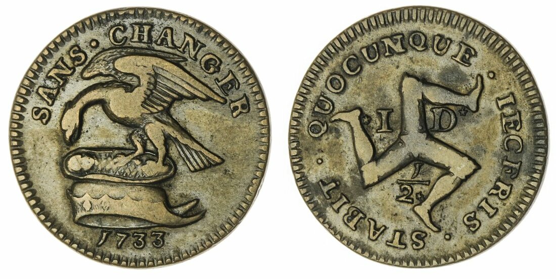 The Hardcastle Collection | Isle of Man, James Stanley, 10th Earl of Derby, Halfpenny, 1733 second issue, inside of cap plain, 5.14g, 6h (S.7409), good fine / near very fine