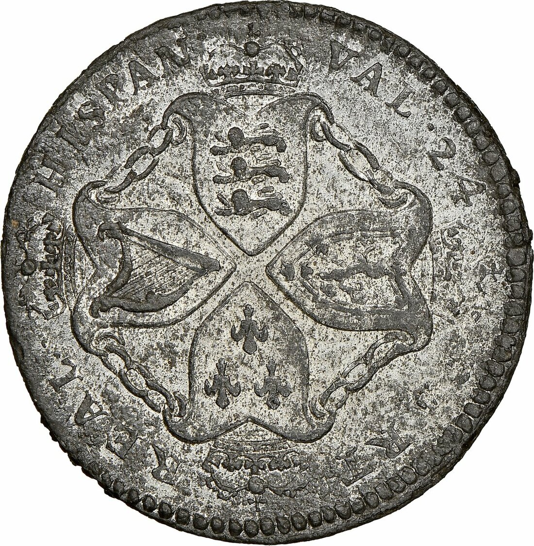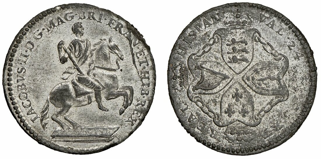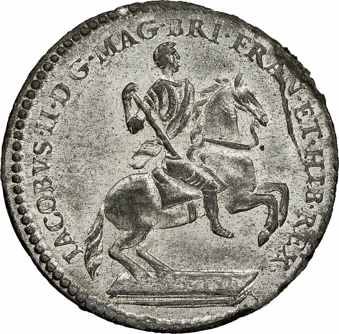 The Hardcastle Collection | MINT STATE 63 | Colonial America, James II (1685-88), Plantation Token of 1/24-Reale, '1688', in tin, King on horseback right, rev. crowned shields cruciform connected by chain, 'straight 4', edge milled (Pridmore 1), a 19th Century striking with the die flaws exhibited in obverse fields with a light trace of pest across otherwise lustrous surfaces, almost uncirculated, an exceptional coin for type, very rare, especially so in this condition, in NGC holder, graded MS63 (Cert. #5878624-020) [Tied 1 of 2 / 4 Finer]