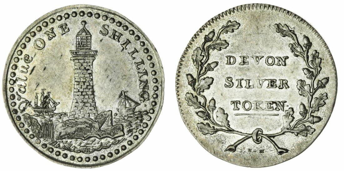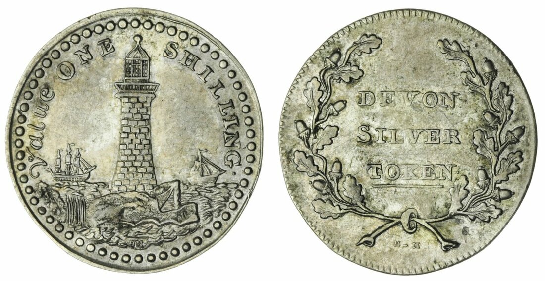 The Hardcastle Collection | Devon, Shillings, 'Devon Silver Tokens', by H Morgan, Eddystone Lighthouse (DH 1), the first lustrous, near extremely fine, the second stained, a bolder very fine (2)