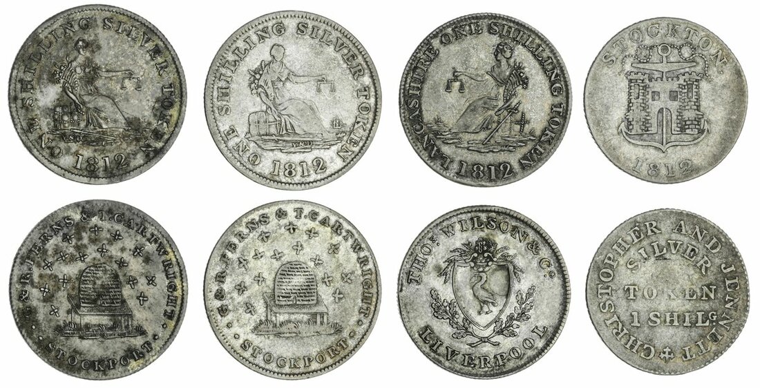 The Hardcastle Collection | Durham, Stockton, Christopher & Jennett, Shilling, 1812; also Cheshire, Stockport, Ferns and Cartwright, Shillings, 1812 (2); lastly, Lancashire, Liverpool, Wilson & Co, Shilling, 1812, fine to very fine (4)