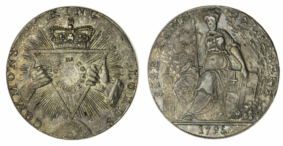 The Hardcastle Collection | Middlesex, London, Bucklersbury, Thomas and Robert Davidson, Proof Halfpenny, 1795, in silver, SISE LANE HALFPENNY, Londinia seated holding sword and shield with arms of London, St. Paul's Cathedral in the background, rev. two hands holding crowned triangle with rays, edge plain, 13.31g, 12h (cf. DNW T17, lot 600; D&H 294c), digs in obverse field around the mark of value as if to obscure the detail, otherwise a bold very fine, very rare