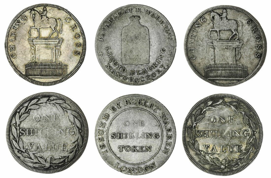 The Hardcastle Collection | Middlesex, London, Liquid Blacking Manufactory, Robert Warren, Shilling, (DH 29), fair / fine; additionally, Charing Cross, Shillings (DH 11), very good to very fine (3)