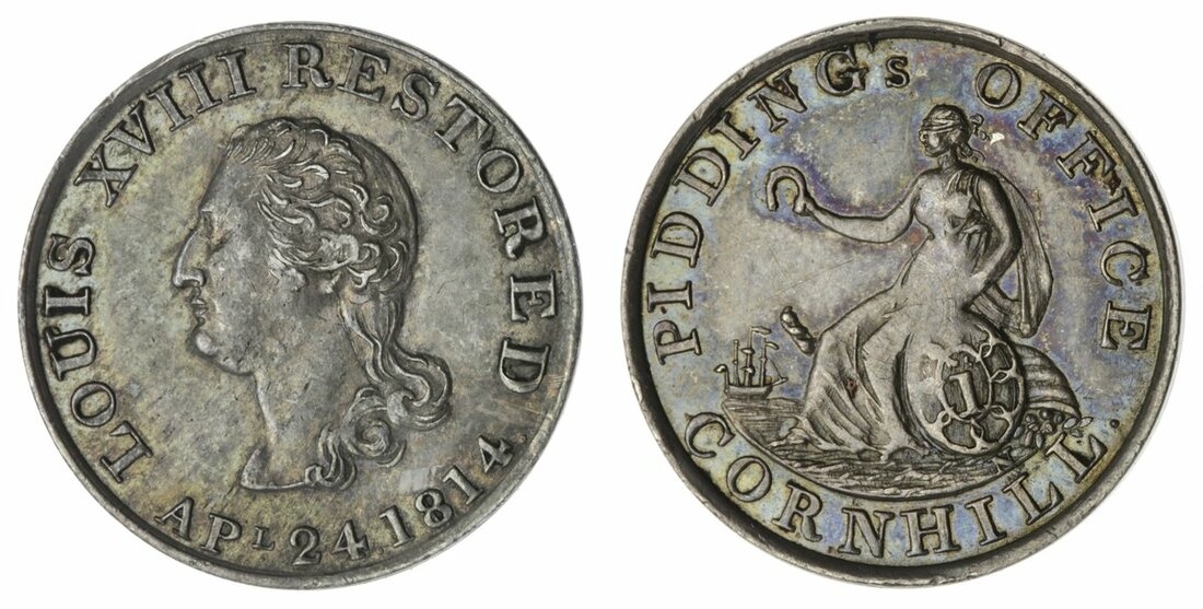The Hardcastle Collection | Middlesex, London, Holborn, Pidding's Office, Cornhill, Silver Penny, 1814, LOUIS XVIII RESTORED, APL. 24 1814, bust of King left, rev. Fortuna seated, holding horse shoe, 22mm., 2.98g (Withers 1715; D & W 318/5; Mitchiner 5781), toned, near extremely fine, scarce