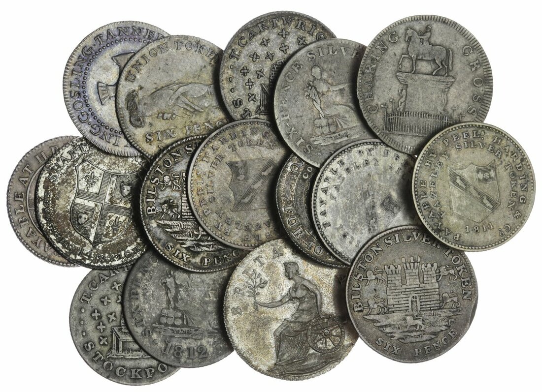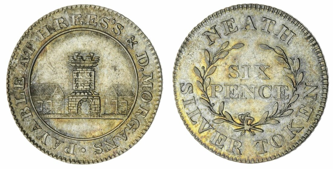 The Hardcastle Collection | Neath, R. Reeses's & D. Morgans, Sixpences (2), the first extremely fine and quite brilliant, the second very fine; additionally, Sixpenny Tokens (16), including Wales, Glamorganshire, Neath, Rees and Morgan Sixpence; also not local Sixpence 1811; also London, Charing Cross Sixpence, conditions from Fine to about Uncirculated (17)
