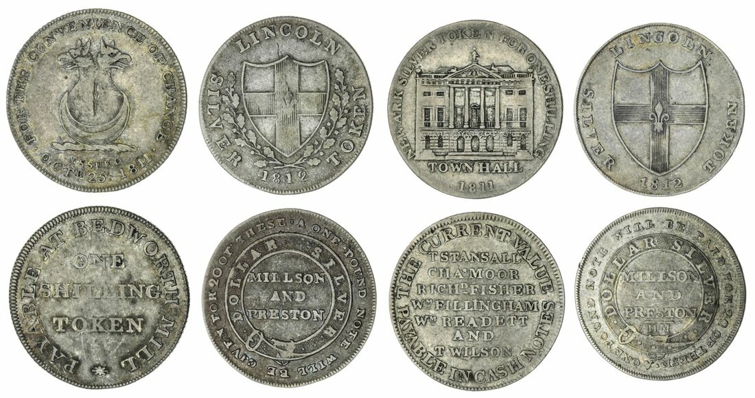 The Hardcastle Collection | Warwickshire, Bedworth, Bedworth Mills, Shilling, 1811; also, Nottinghamshire, Newark, T Stansall, Shilling, 1811; additionally, Lincolnshire, Lincoln, Wilson & Preston, Shillings, 1812 (2), generally fine (4)