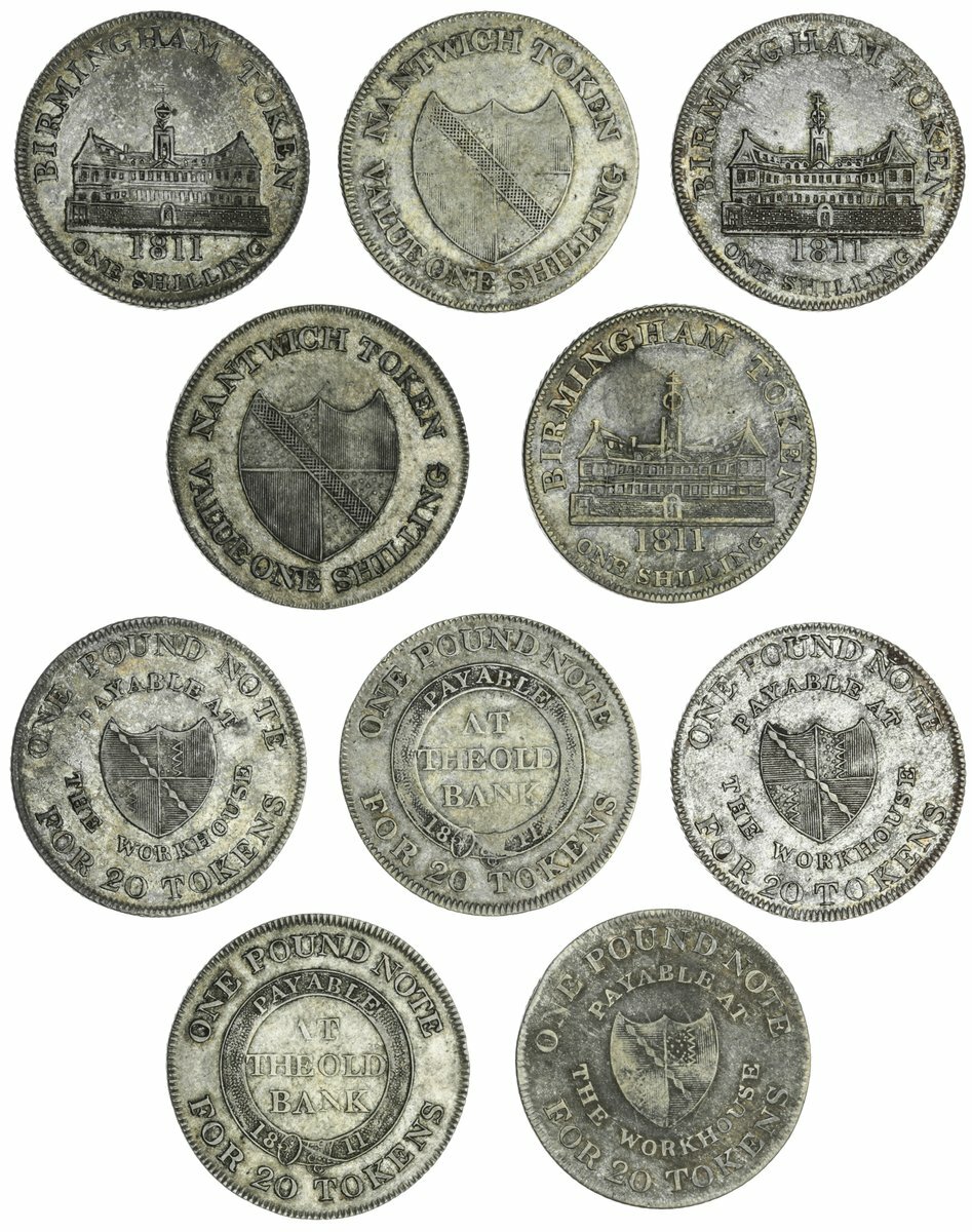 The Hardcastle Collection | Warwickshire, Birmingham, The Workhouse, Shillings, 1811 (3), fine to near extremely fine; also, Cheshire, Nantwich, The Old Bank, Shillings, 1811 (2), better than fine (5)