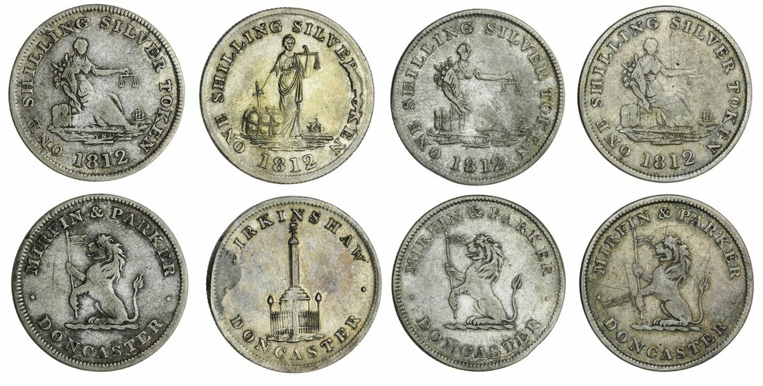 The Hardcastle Collection | Yorkshire, Doncaster, New Betting Rooms, 1800, Silver ticket, by T. Halliday, 35mm, 14.11g (W 1527; D & W 322/3), weak struck at centre, very fine with a pleasing old toning; another, but silver-plated, silvered with a copper core exposed at rims, 35mm, 20.70g, base exposed on rims, otherwise very fine; addtionally, Doncaster, Mirfin & Parker, Shillings, 1812 (3); another, Birkinshaw, Shilling, 1812, generally near fine, the last with die cudding, a bolder very fine (6)