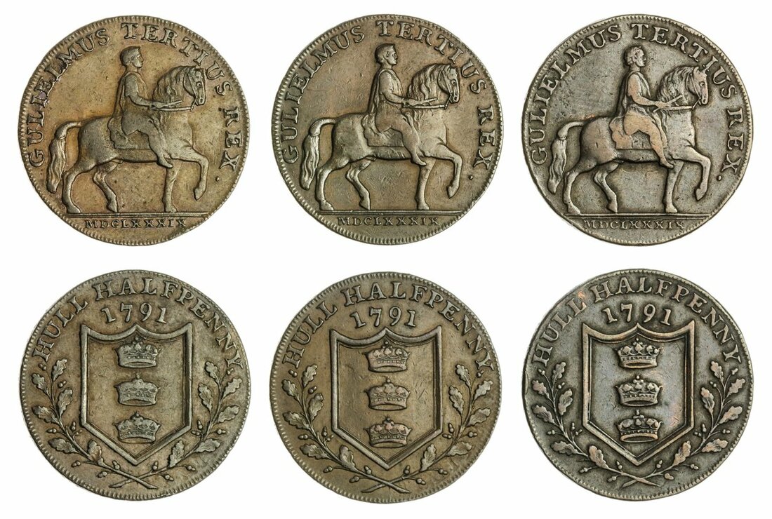 The Hardcastle Collection | Yorkshire, Hull, Halfpenny Tokens, William III on horseback, rev. crest of Hull, date and denomination (D&H 63), conditions around Very Fine. (3)