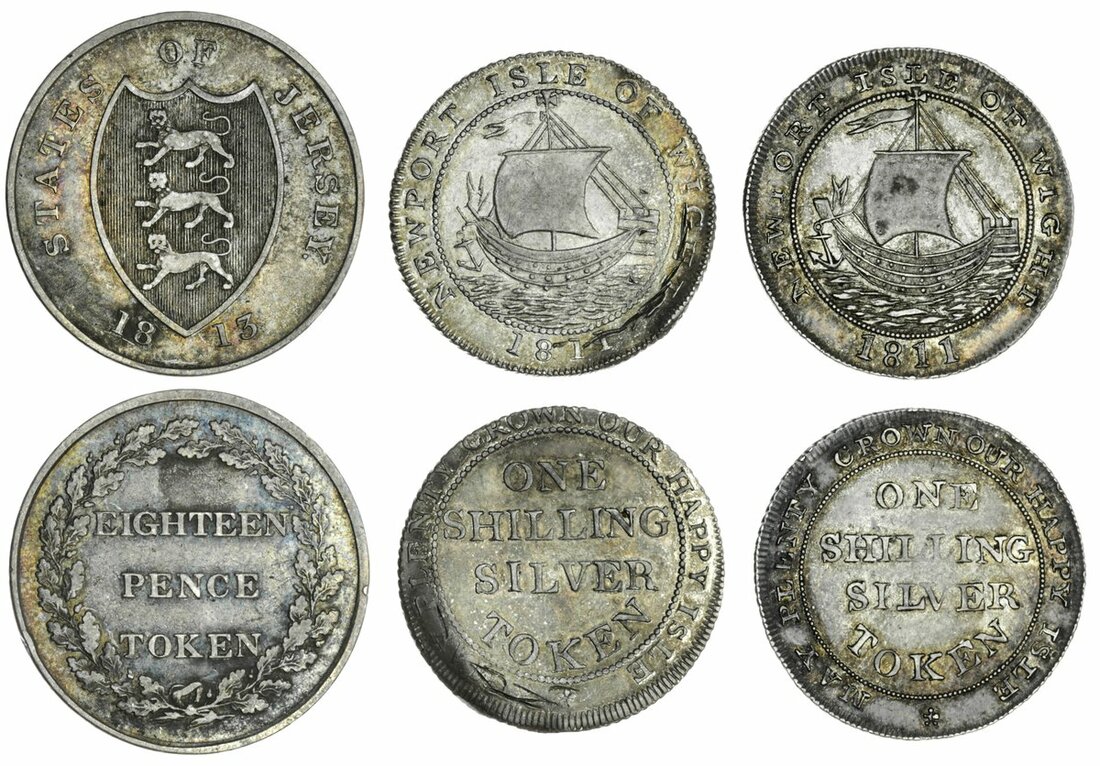 The Hardcastle Collection | Channel Islands, Jersey, Eighteenpence, 1813, Fine; also Hampshire, Newport, Isle of Wight, two silver Shilling tokens 1811, both Very Fine, one with tool marks and bends (3)