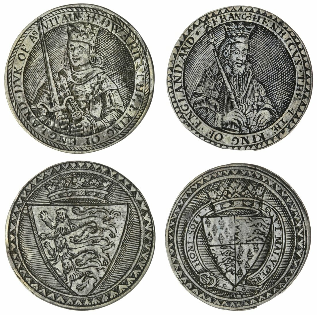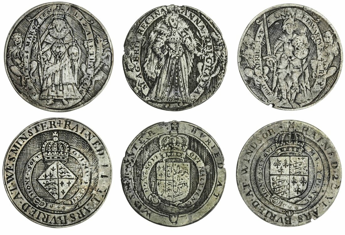 The Hardcastle Collection | Sovereigns of England (17th Century), AR Counters, in the style of Simon Van de Passe, including, Edward I, three-quarter busts facing, rev. armorial shield surrounded by ornamental border, small size (2), 1.90g, 12h; Henry IV, similar, 2.70g, 2h; also, larger size (3), Edward IV, 2.41g, 12h; Elizabeth I, 1.98g, 1h; lastly, Anna of Denmark, wife of James I, 2.28g, 1h (MI 380/282), the smaller piece very fine, the larger issues rubbed and with minor splitting, generally fair to fine with evidence of gilding (5)