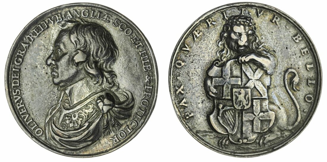 The Hardcastle Collection | Oliver Cromwell, Lord Protector, Cast AR Medal, 1653, after T. Simon, armoured and draped bust left, rev. lion holding arms, 38mm, 10.34g (MI 403/33; Eimer 188b), tooling in fields, otherwise toned, about very fine / fine, a popular medal