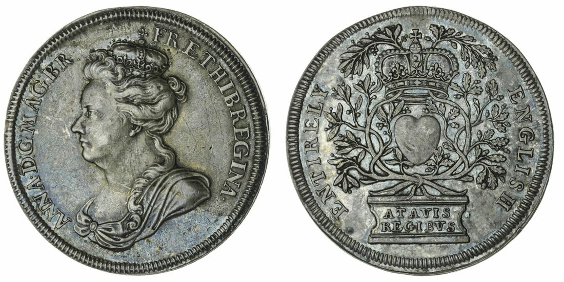 The Hardcastle Collection | Anne (1702-14), Accession, AR Medal, 1702, by J. Croker, crowned, and draped bust left, rev, ENTIRELY ENGLISH, crown over heart in wreath of oak, all on pedestal, 35mm., 15.53g (MI 227/1; Eimer 388), some scratches in fields and on rims including a knock at 10 o'clock, otherwise toned, a bold very fine with residual brilliance to reverse