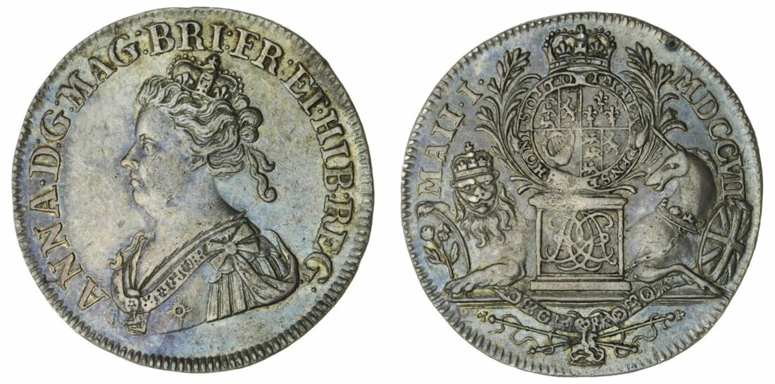 The Hardcastle Collection | Anne (1702-14), Act of Union, AR Medallet, 1707, by J. Croker, crowned and draped bust left, rev crowned Garter shield on plinth, flaked by lion and unicorn supporters, 26mm., 3.16g, 6h (MI 295/107; Eimer 424b), bluish toning, good very fine