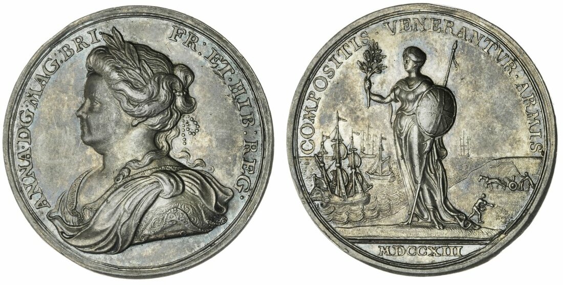 The Hardcastle Collection | Anne (1702-14), Peace of Utrecht, AR Medal, 1713, by J. Croker, draped bust left, rev. Britannia standing left, holding laurel branch, naval vista in background, 35mm, 14.76g, 12h (Hardaker 962; MI 400/257; Eimer 460), light edge bruising at 11 o'clock, otherwise much underlying brilliance, near extremely fine