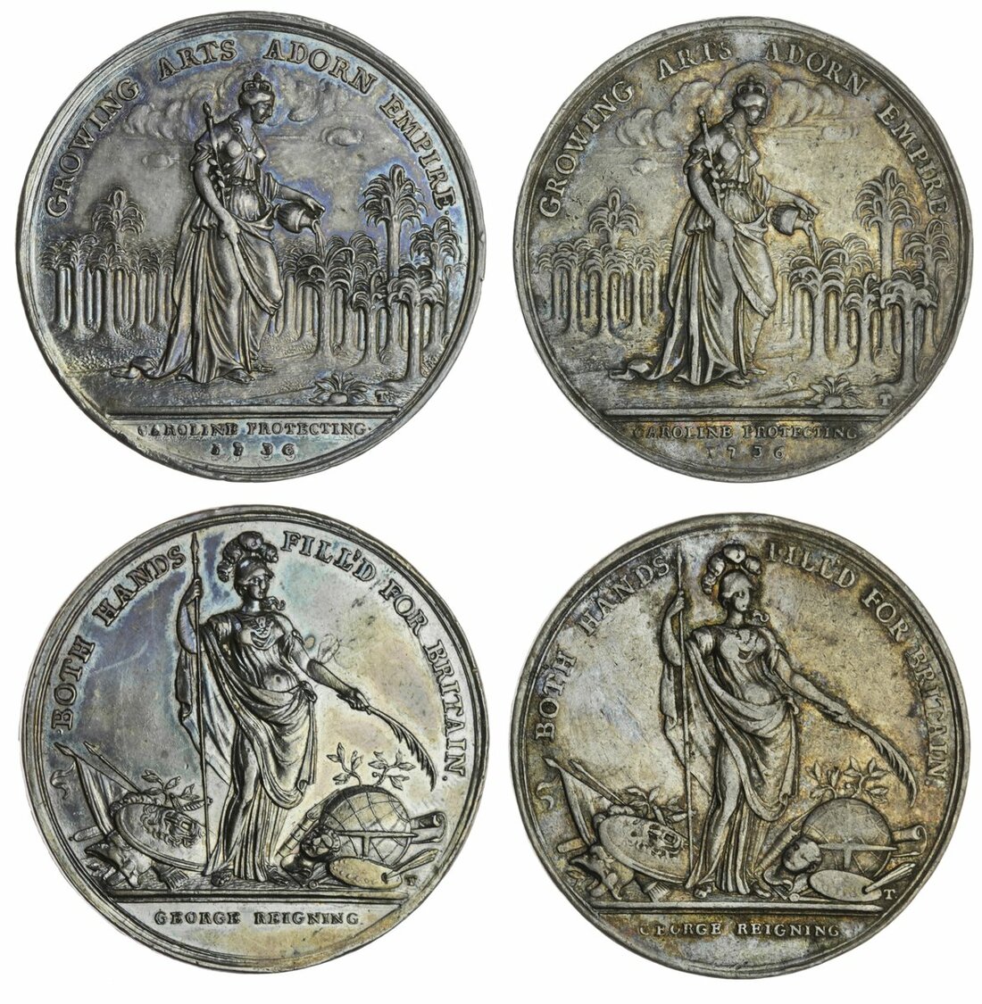 The Hardcastle Collection | George II (1727-60), 'Jernegan's Lottery', AR Medals, 1736, by J. S. Tanner (2), Minerva standing between military trophies and emblems of arts and sciences, rev. Queen Caroline watering palms, 39.mm, 20.28g (Eimer 537; MI 517/72; Betts 169), the first cleaned, the second tooled, both about very fine or better (2)
