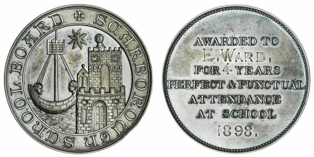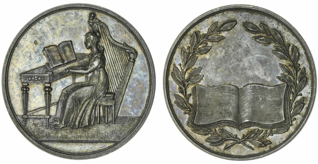 The Hardcastle Collection | 19th Century Silver Prize Medals (2), including: North Yorkshire, Scarborough, School Board, Perfect Attendance Medallion, AWARDED TO E. WARD FOR 4 YEARS PERFECT AND PUNCTUAL ATTENDANCE AT SCHOOL 1898', 45 mm, 47.48g, past cleaning, now retoning, otherwise about extremely fine with a light edge bruise; additionally, Musical Prize Award, unsigned, woman playing piano, harp behind, rev. laurel, sheet music, 39mm, 17.28g, good extremely fine (2)