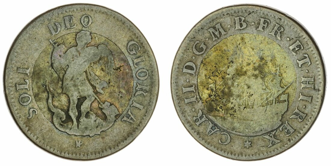 The Hardcastle Collection | Charles II (1660-85), Touchpiece or Pattern Halfpenny, on a copper flan with a brass centre, CAR. II D | G. M. B. FR. ET. HI. REX, three masted ship sailing left, rev. SOLI DEO GLORIA, St. Michael the Archangel slaying the dragon, 29.5mm., 10.45g (Woolf, BNJ 1979, pp. 108-9; BMC 498), poor to good, scarce