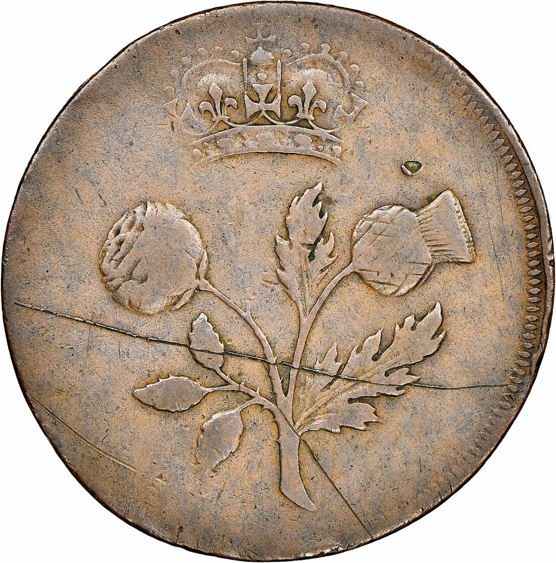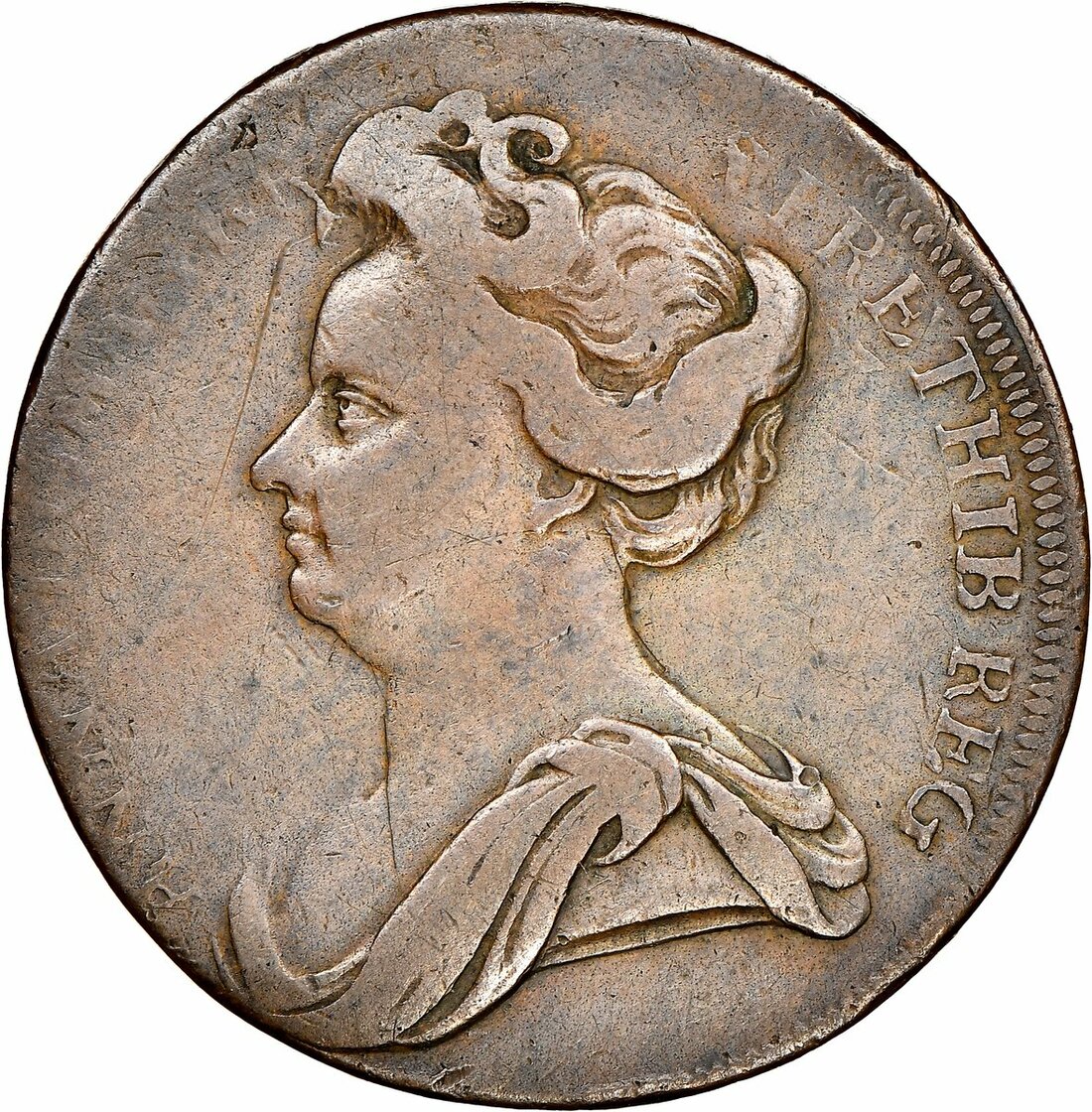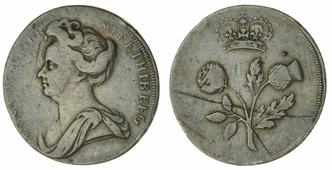 The Hardcastle Collection | Anne (1702-14), Pattern Halfpenny, c. 1713-14, by Isaac Newton, in copper, draped bust left, rev. crowned thistle, edge plain, 10.56g, 12h (Peck 720), scoring to reverse, otherwise an evident pocket piece, nevertheless fine, rare, in NGC holder, graded Fine Details ~ Damaged (Cert. #5878622-015)