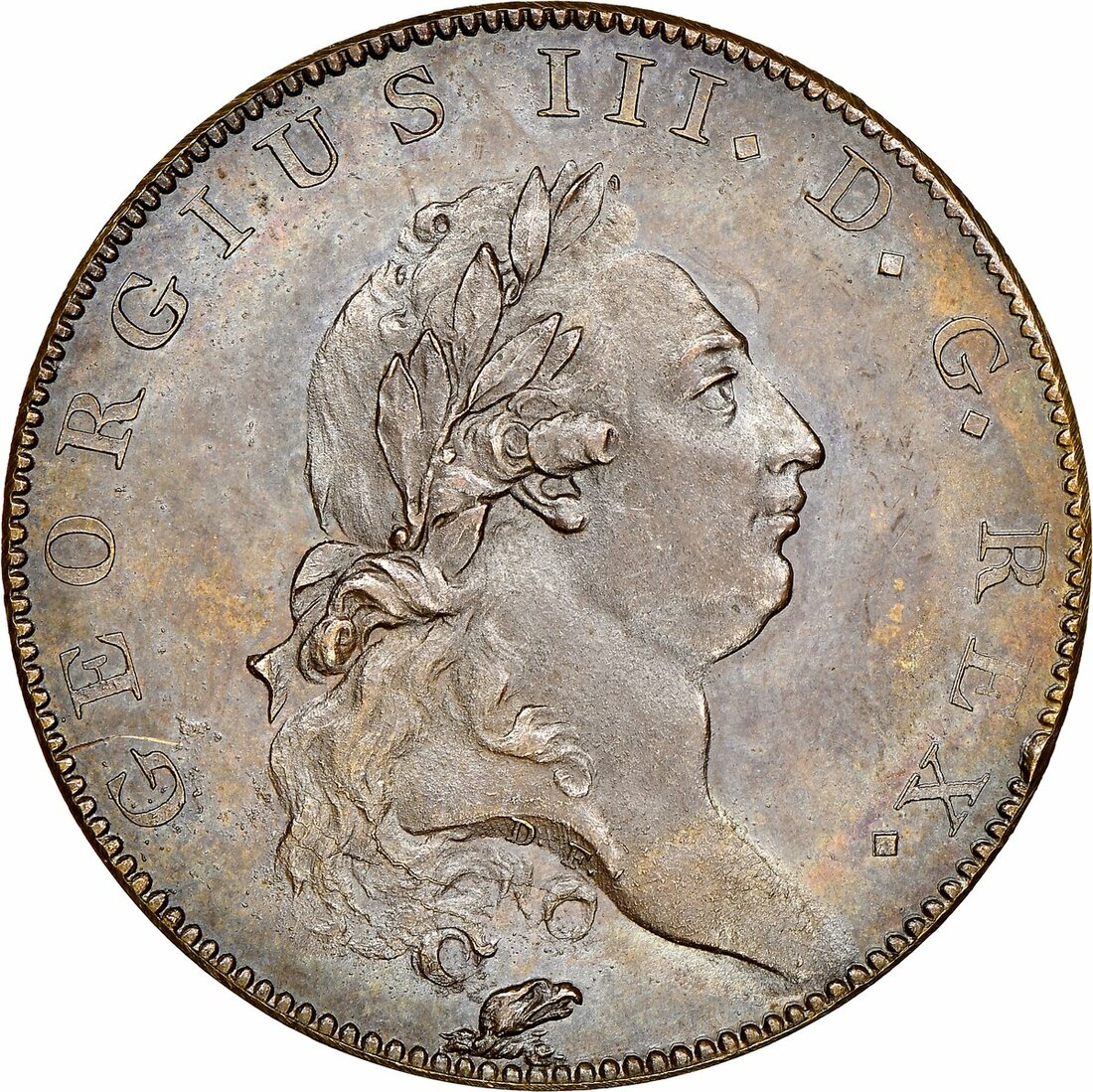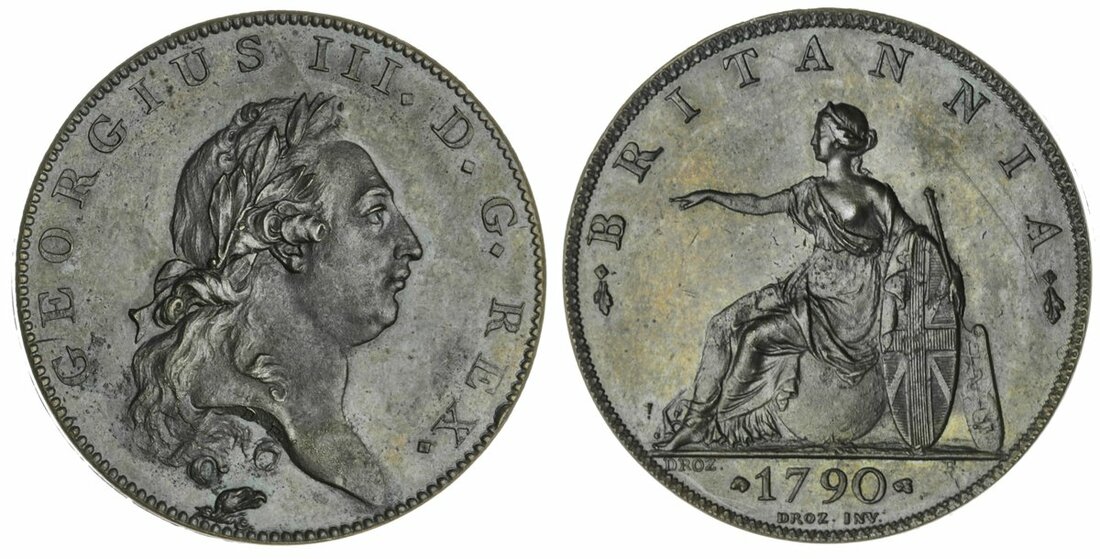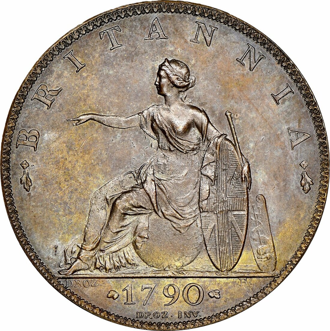 The Hardcastle Collection | PROOF 63 BROWN | George III (1760-1820), Pattern Halfpenny, 1790, by W J Taylor after J-P Droz, in bronzed copper, laureate head right, eagle head on thunderbolt below, rev. Britannia seated left, resting on shield and spear, right arm outstretched, signature below date in exergue, edge plain (Peck 990; S-), dark tone with die rust and a crack on obverse at 7 o'clock, otherwise a bold extremely fine