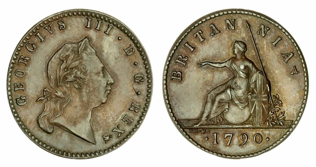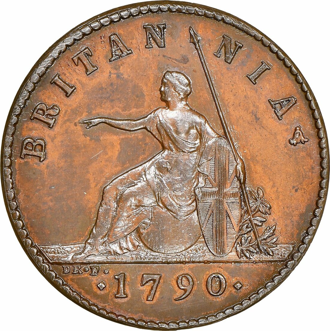 The Hardcastle Collection | PROOF 62 BROWN ~ Top Pop | George III (1760-1820), Pattern Farthing, 1790, by W J Taylor after J-P Droz, in bronzed copper, laureate head right, rev. BRITAN NIA, Britannia seated left, resting on shield and spear, right arm outstretched, signature and date in exergue, 4.99g, 6h (cf. Pywell-Phillips 458; Peck 1031), uneven toning, a bolder extremely fine, in NGC holder, graded PF62 BN (Cert. #5878624-007) [*Single Finest*]