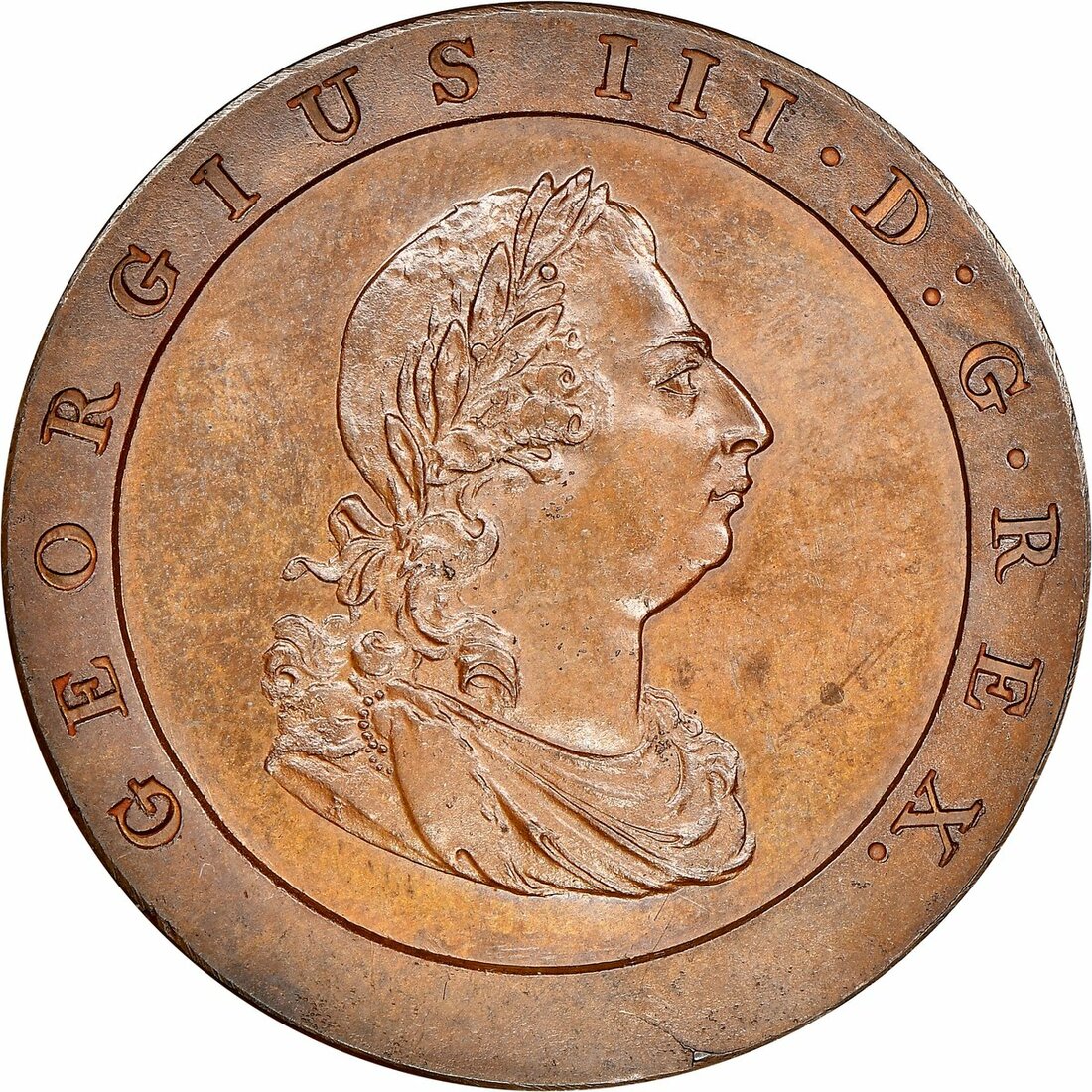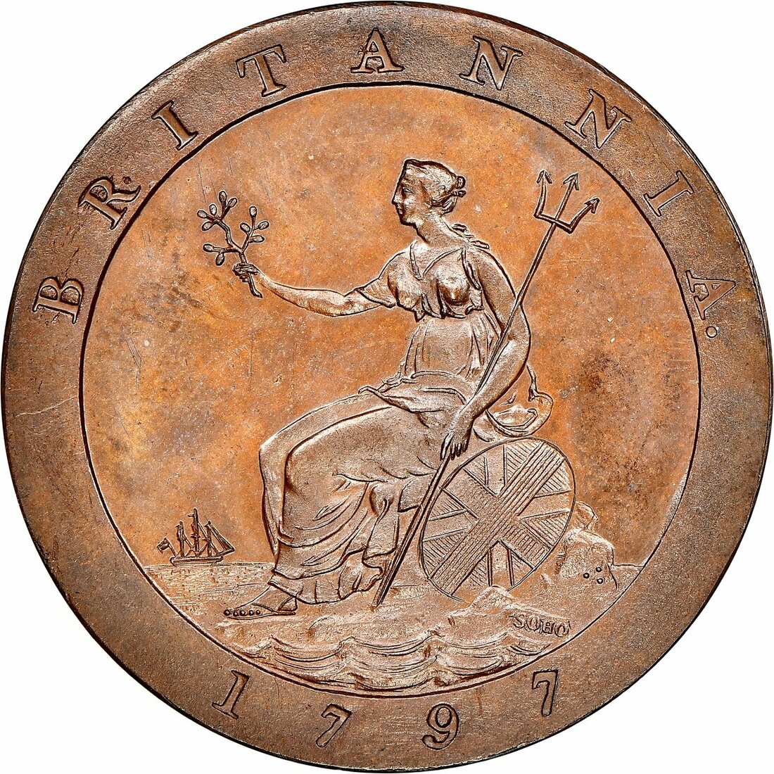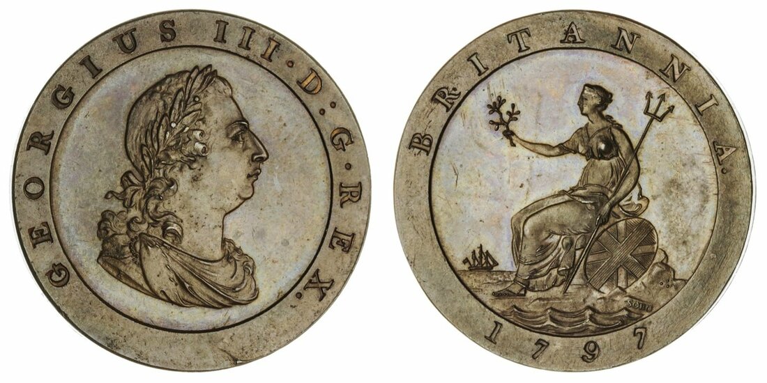 The Hardcastle Collection | PROOF 64 BROWN | George III (1760-1820), Pattern Halfpenny, 1797, 'Cartwheel' type, by C H Küchler, in copper, Soho, laureate and draped bust right, two berries in wreath, rev. Britannia seated left, holding olive branch and trident, ship left with three stays (Peck 1157), some faint carbon spotting before bust and rub to Britannia's bosom, otherwise a wonderful miror-like proof, about brilliant uncirculated, in NGC holder, graded PF64 BN (Cert. #5878622-006)