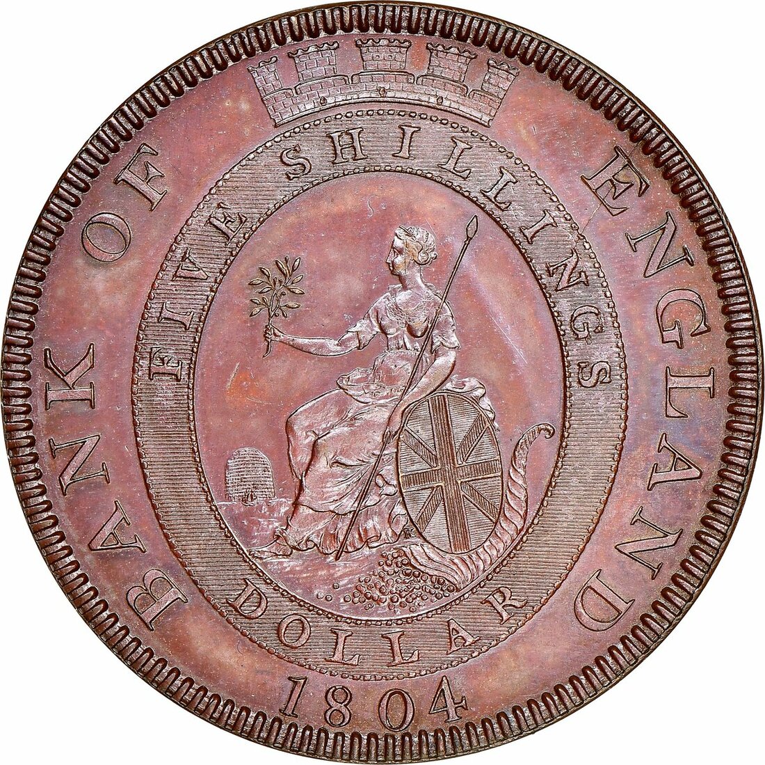 The Hardcastle Collection | PROOF 62 BROWN | George III, Bank of England, Pattern Dollar, 1804, in copper, on a thick planchet, laureate, draped and cuirassed bust right, rev. Britannia seated with crowned, oval band, 36.73g, 6h (ESC 1935 [152]), an attractive proof with reddish brown patination, good extremely fine, in NGC holder, graded PF62 BN (Cert. #5878624-002)