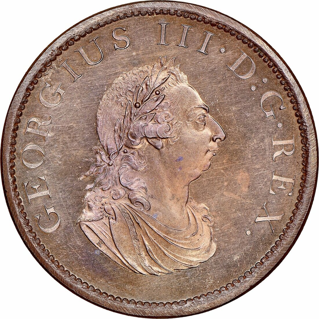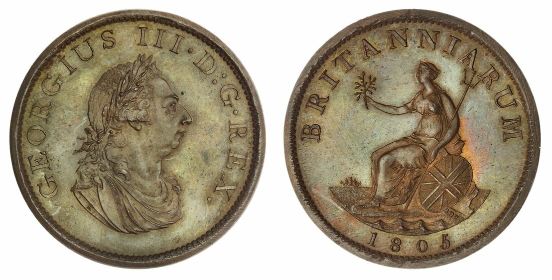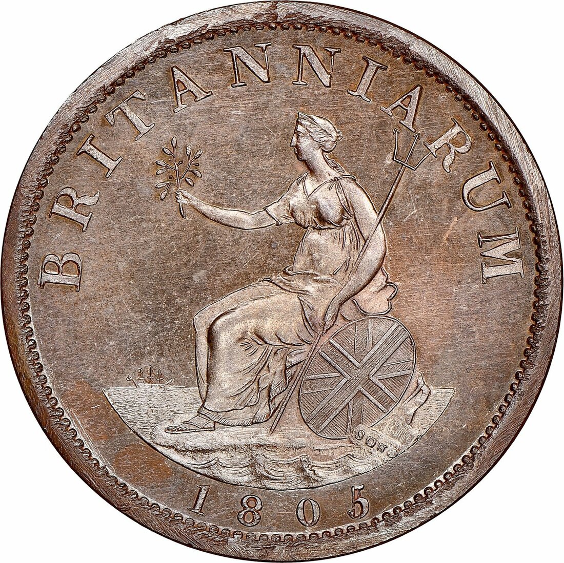 The Hardcastle Collection | PROOF 64 RED-BROWN | George III (1760-1820), Pattern Halfpenny, 1805, in copper, by W J Taylor from Soho dies, laureate and draped bust right, K on truncation, rev. Britannia seated left, 13.14g, 6h (Peck 1309), a later striking from refurbished dies, otherwise a handsome proof with a trace of orange-brown and golden hues around central devices, much as struck, in NGC holder, graded PF64 RB (Cert. #5878624-011)