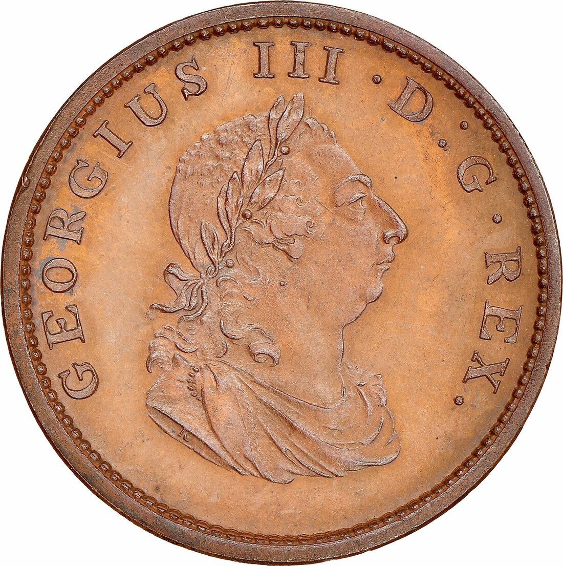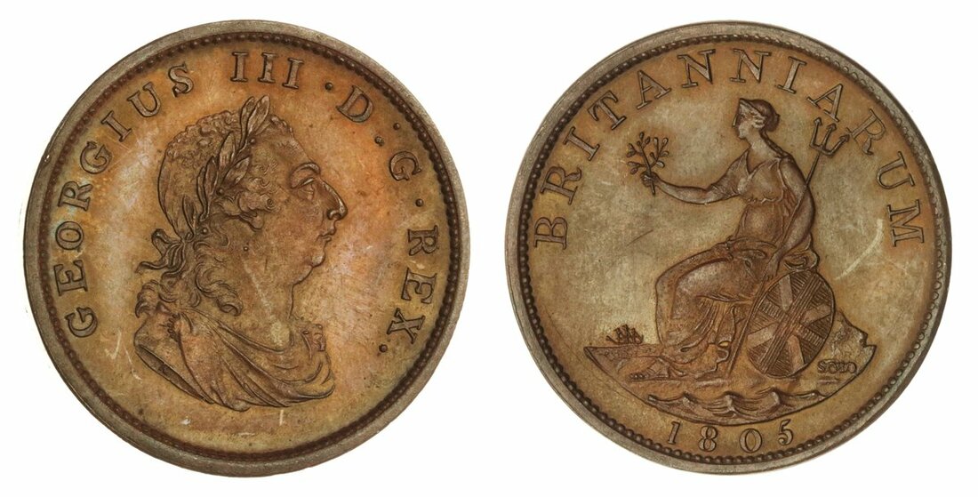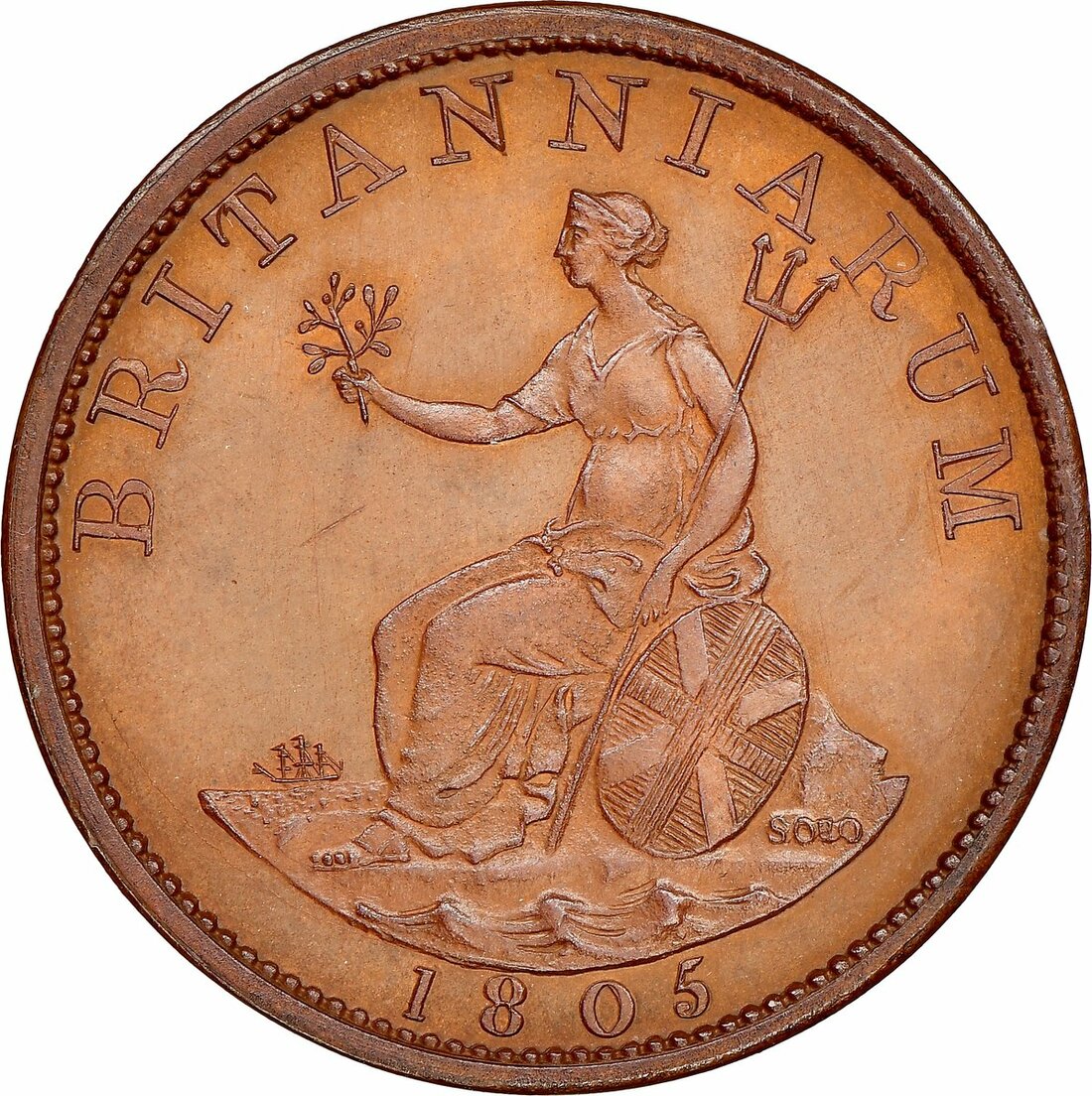 The Hardcastle Collection | PROOF 64 BROWN ~ [Joint Finest] | George III (1760-1820), Pattern Farthing, 1805, in copper, by W J Taylor from Soho dies, O over R in GEORGIVS, laureate and draped bust right, K on truncation, rev. Britannia seated left, edge plain, 5.91g, 6h (Pywell-Phillips 469; Peck 1319), a later striking from refurbished dies, a small scratch in reverse field, otherwise a charming orange-brown patina, much as struck, in NGC holder, graded PF64 BN (Cert. #5878624-012)