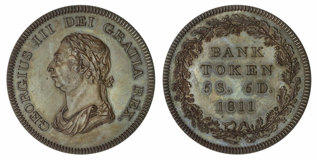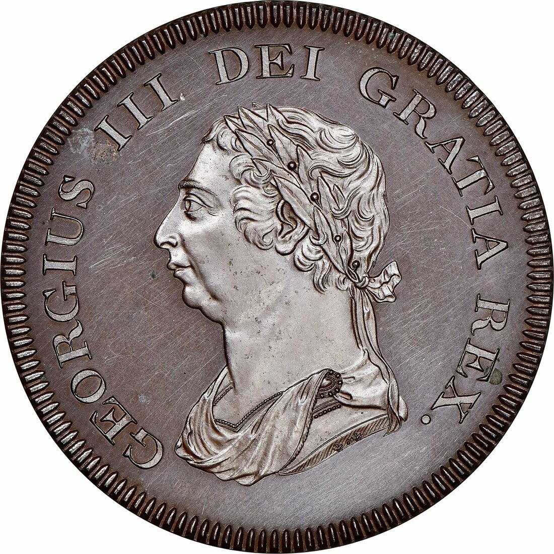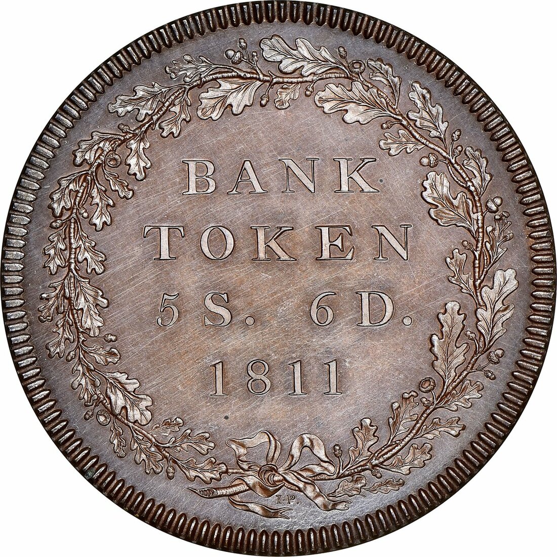 The Hardcastle Collection | PROOF 64 BROWN | George III, Bank of England, Pattern Dollar of Five Shillings and Sixpence, 1811, by W J Taylor after John Phillp, in copper, laureate and draped bust left, stop nearer to bust, rev. value inside oak wreath, 25.63g, 12h (L&s 126; Davis 37; Pywell-Phillips 438; ESC 1996 [206]), a wholesome proof, brilliant fields sharply framing the cameo-like portraiture, much as struck, in NGC holder, graded PF64 BN (Cert. #5878624-003) [Tied 1 of 9 / 8 Higher]