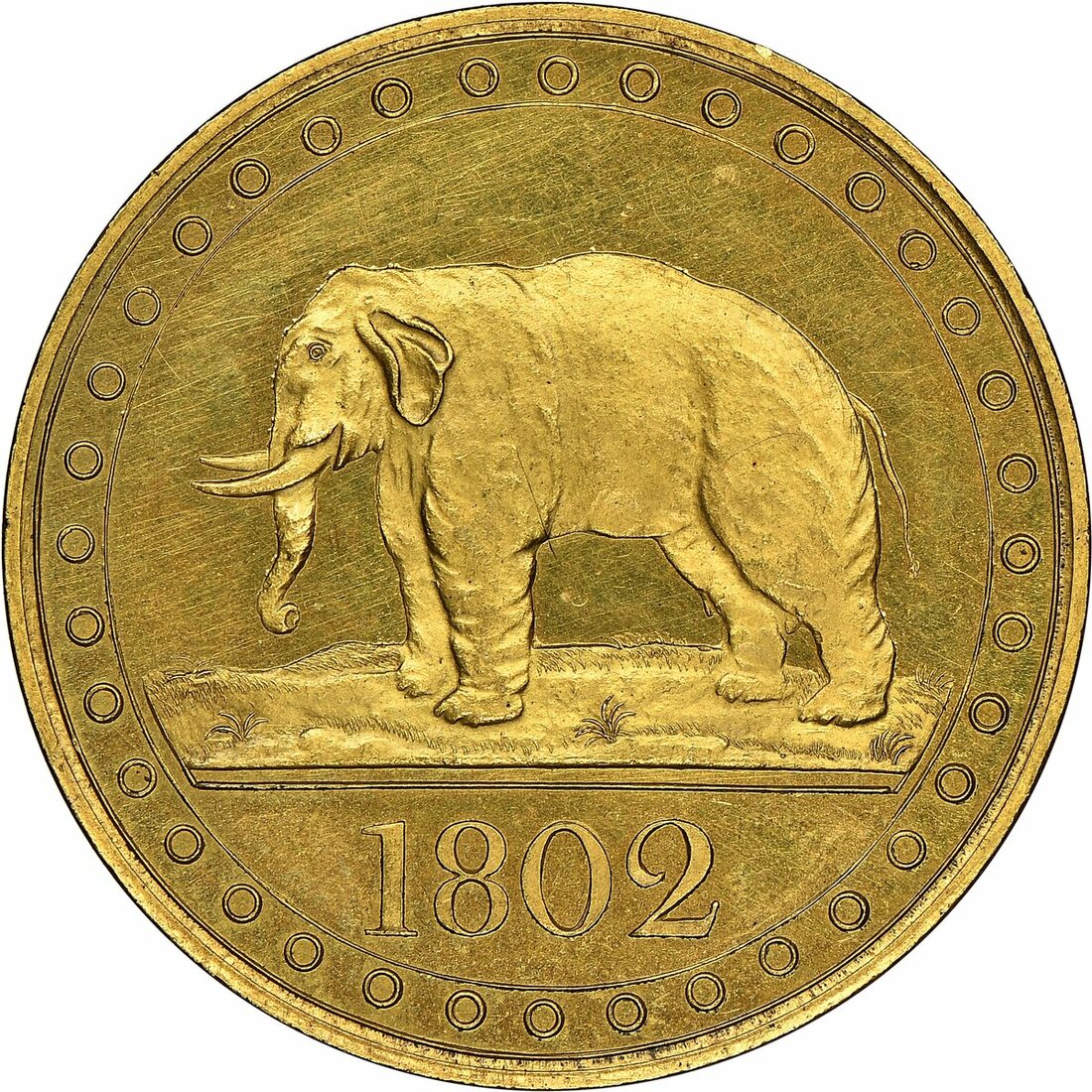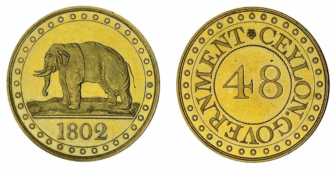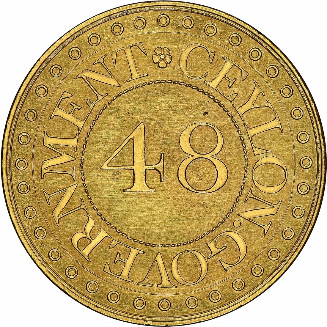 The Hardcastle Collection | PROOF 64 ~ [Top Pop] | British Administration, Ceylon (Sri Lanka), Proof 1/48-Rix Dollar, 1802, in gilt-copper, Elephant left, date below, rev. CEYLON GOVERNMENT, 48 in centre, 6h (Pridmore 83B; KM 75), brilliant uncirculated, in NGC holder, graded PF64 (Cert. #5878623-003) [Tied 1 of 2 ~ *Joint Finest*]