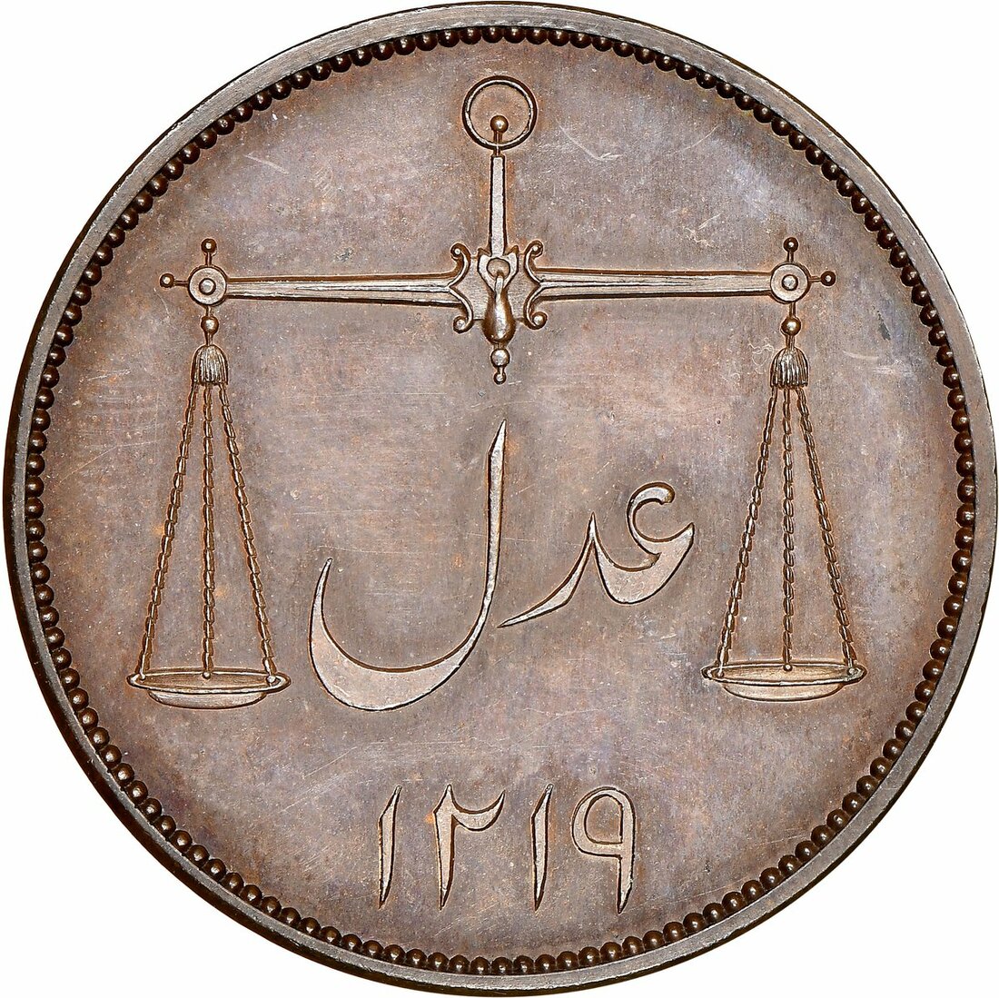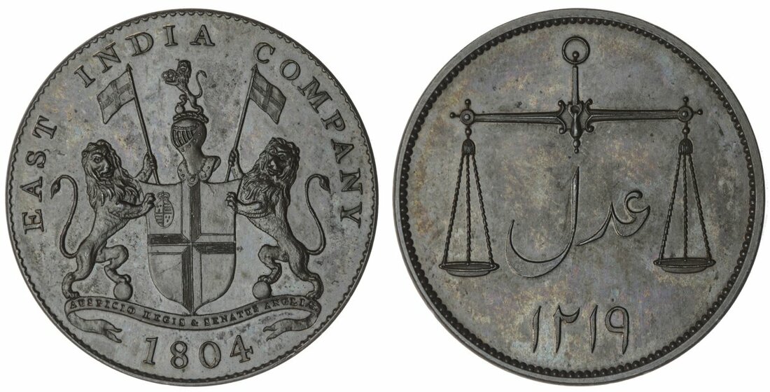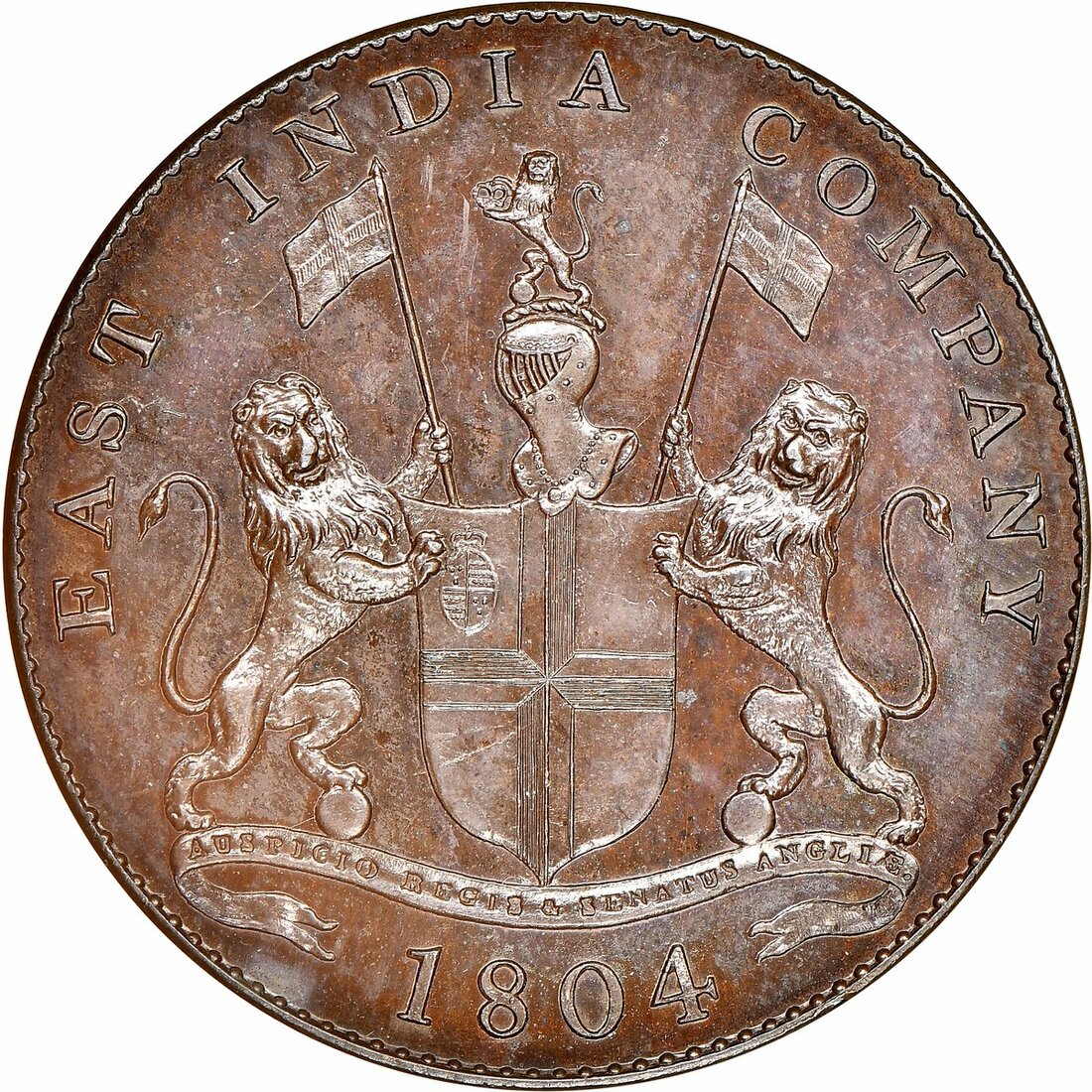 The Hardcastle Collection | PROOF 64 BROWN | British East India Company, Bombay Presidency, Proof Double-Pice, 1804 [AH1219], in copper, Soho, Arms of the East India Company, rev. scales with Persian legend below, 13.19g, 6h (Stevens 8.54 var; Pridmore 195 var), the die axis unrecorded for Proof issues, with an attractive deep chocolate tone, choice uncirculated, very rare, in NGC holder, graded PF64 BN (Cert. #5878623-011) [Tied 1 of 5 / 4 Finer]
