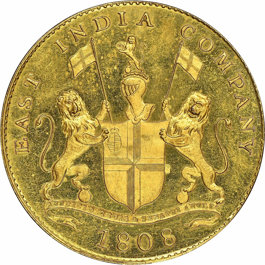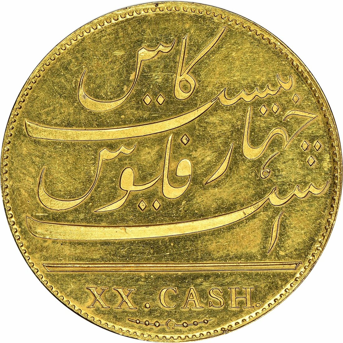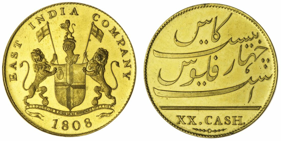 The Hardcastle Collection | PROOF 62 CAMEO ~ [Top Pop] | British East India Company, Madras Presidency, Proof 20-Cash, 1808, in gilt copper, Soho, Arms of the East India Company, date below, rev. Persian legend, XX. CASH in exergue, 10.88g, 6h (Stevens 5.117 var; Pridmore 195 var), brilliant, good extremely fine and an unusual weight between the Heavy and Light issues, in NGC holder, graded PF62 CAMEO (Cert. #5878623-015) [*Single Finest*]