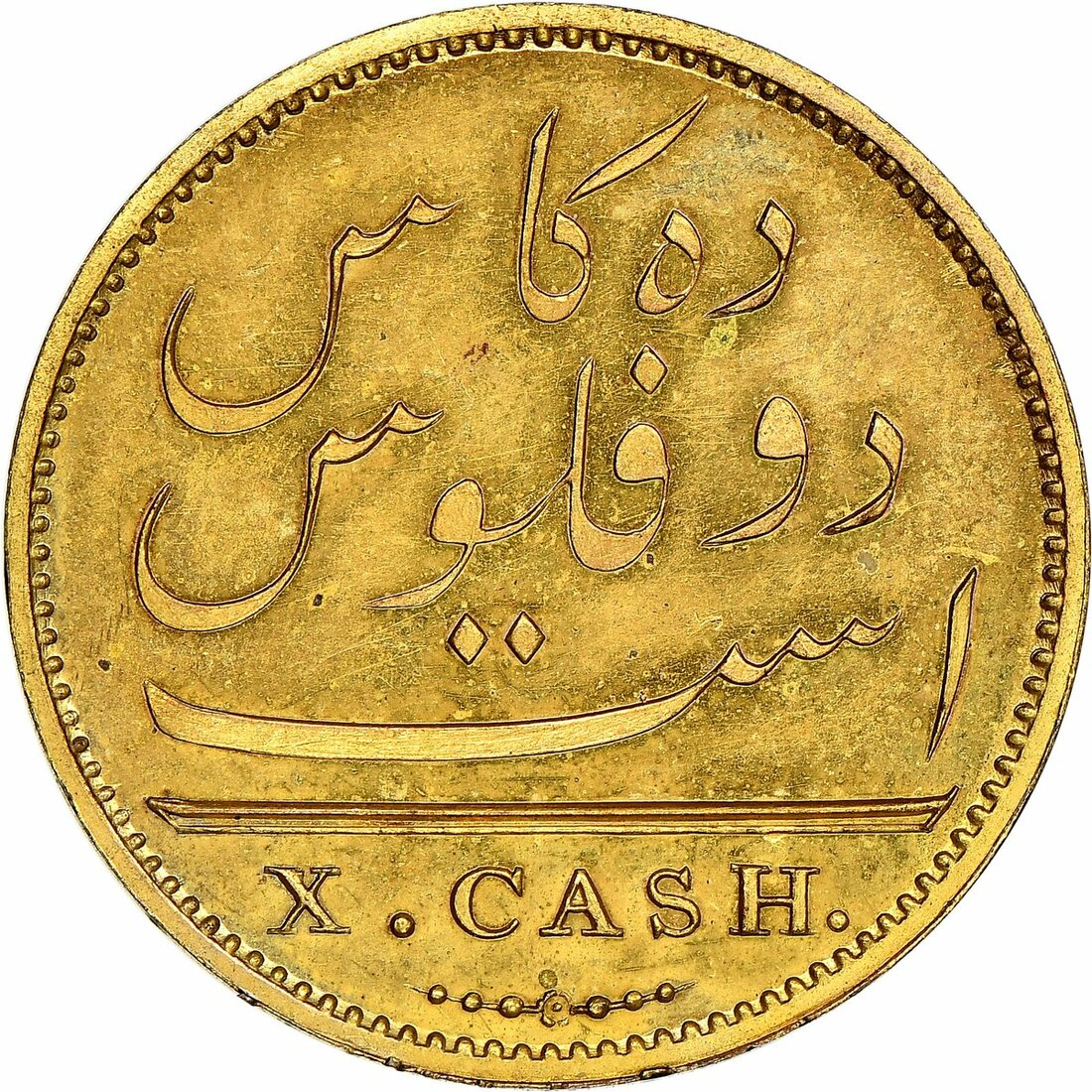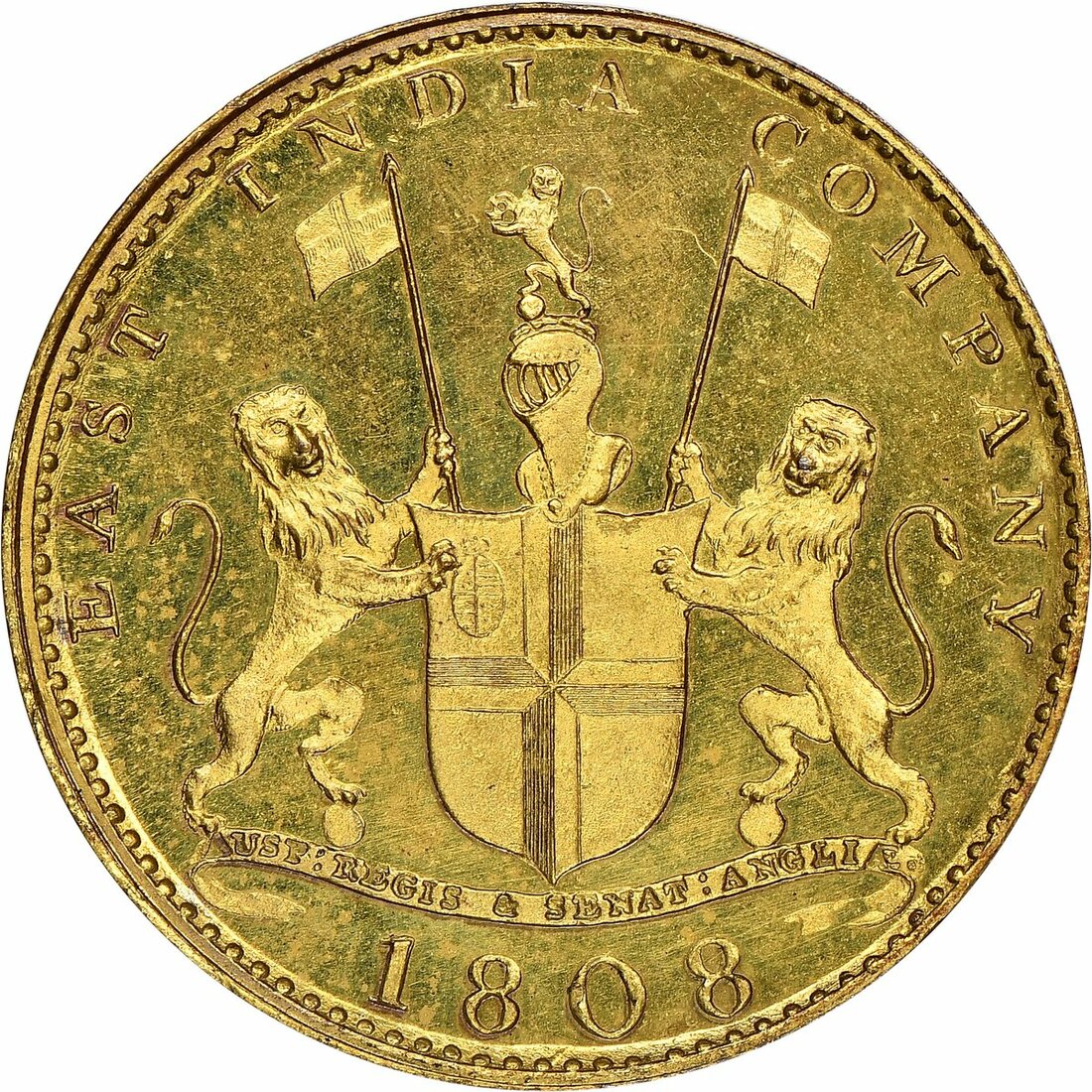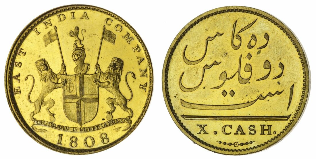 The Hardcastle Collection | PROOF 63 ~ [Top Pop] | British East India Company, Madras Presidency, Proof 10-Cash, 1808, 'Heavy Issue', in gilt copper, Soho, Arms of the East India Company, date below, rev. Persian legend, X. CASH in exergue, 6.78g, 6h (Stevens 5.132; Pridmore 204), choice, about brilliant uncirculated, extremely rare, in NGC holder, graded PF63 (Cert. #5878623-016) [*Single Finest*]