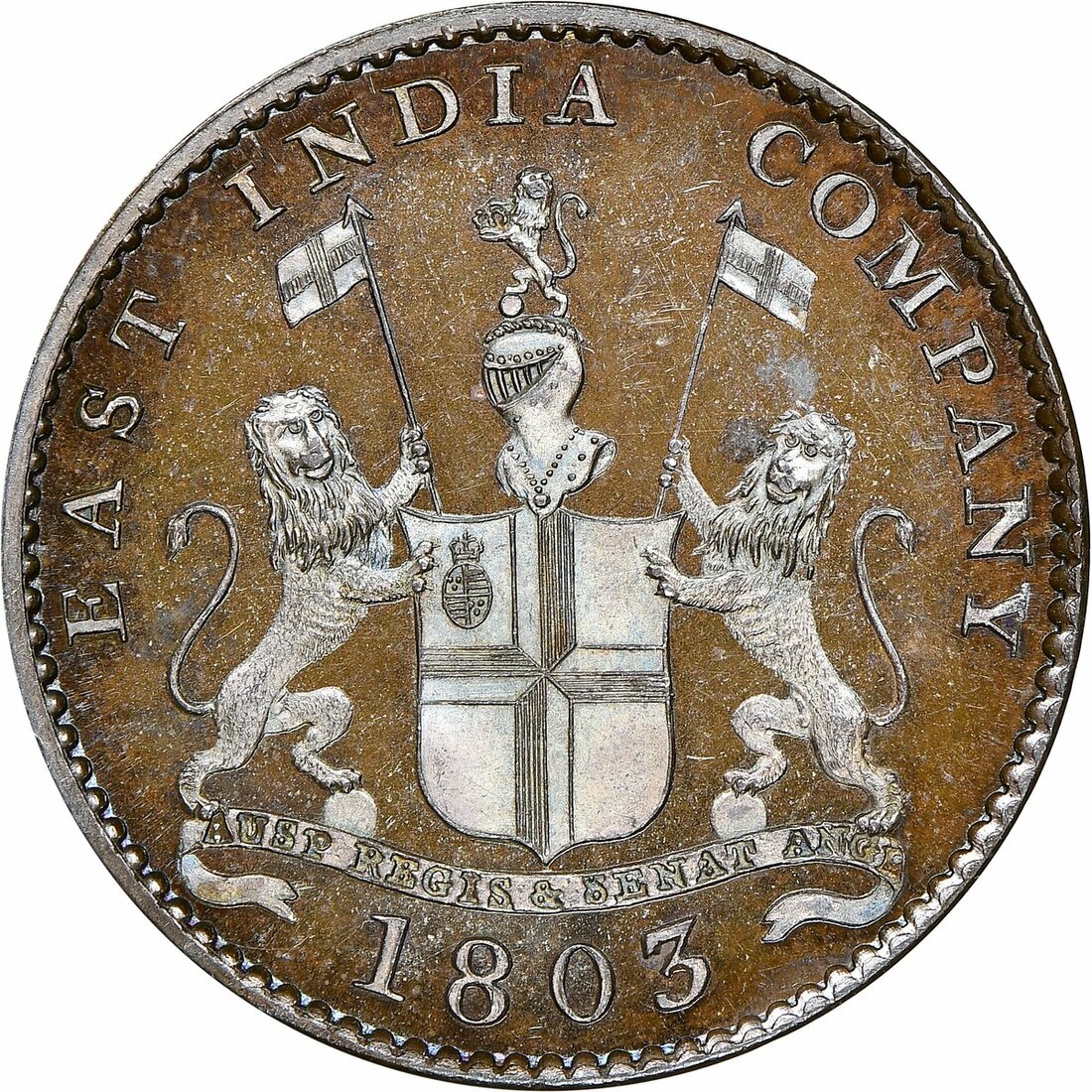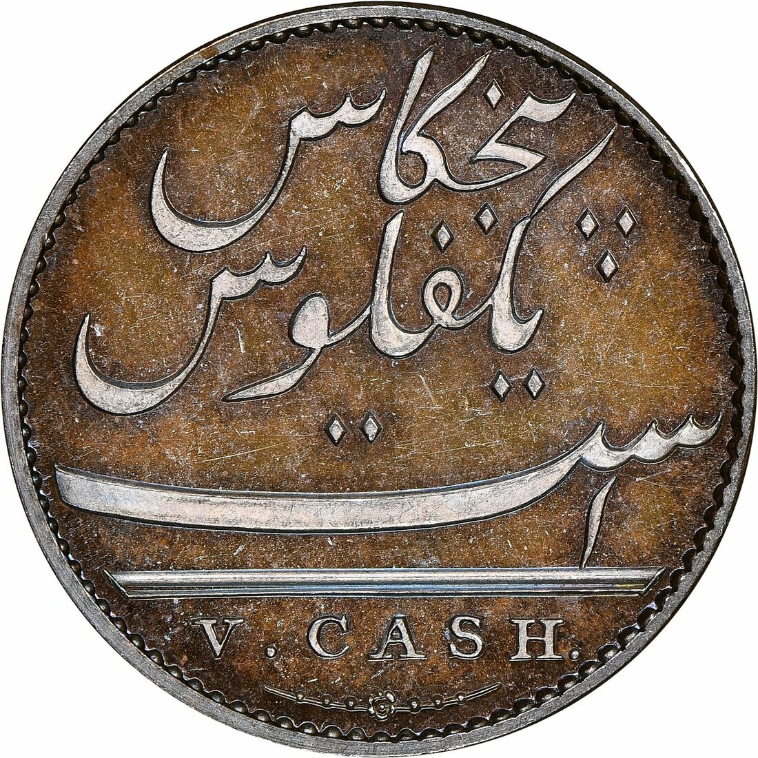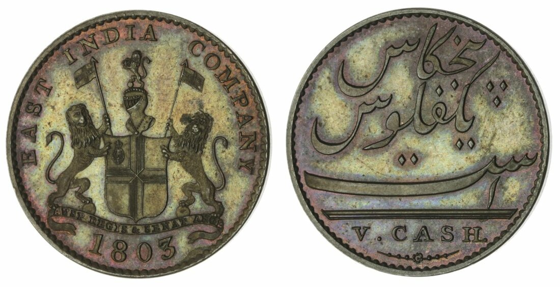 The Hardcastle Collection | PROOF 64 BROWN CAMEO ~ [Top Pop] | British East India Company, Madras Presidency, Proof 5-Cash, 1803, 'Light Issue', in copper, Soho, Arms of the East India Company, date below, rev. Persian legend, V. CASH in exergue, 3.15g, 6h (Stevens 5.141; Pridmore 209), about as struck, attractive deep tone with reddish lustre, uncirculated, scarce, in NGC holder, graded PF64 BNC (Cert. #5878623-018) [*Single Finest*]