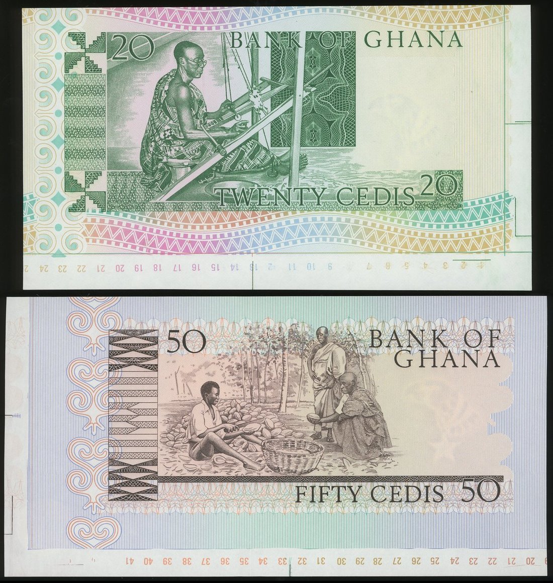 (x) Bank of Ghana, progressive proofs for 20 and 50 cedis, ND (1979-82), obverse with only underprint design, reverse, fully printed,