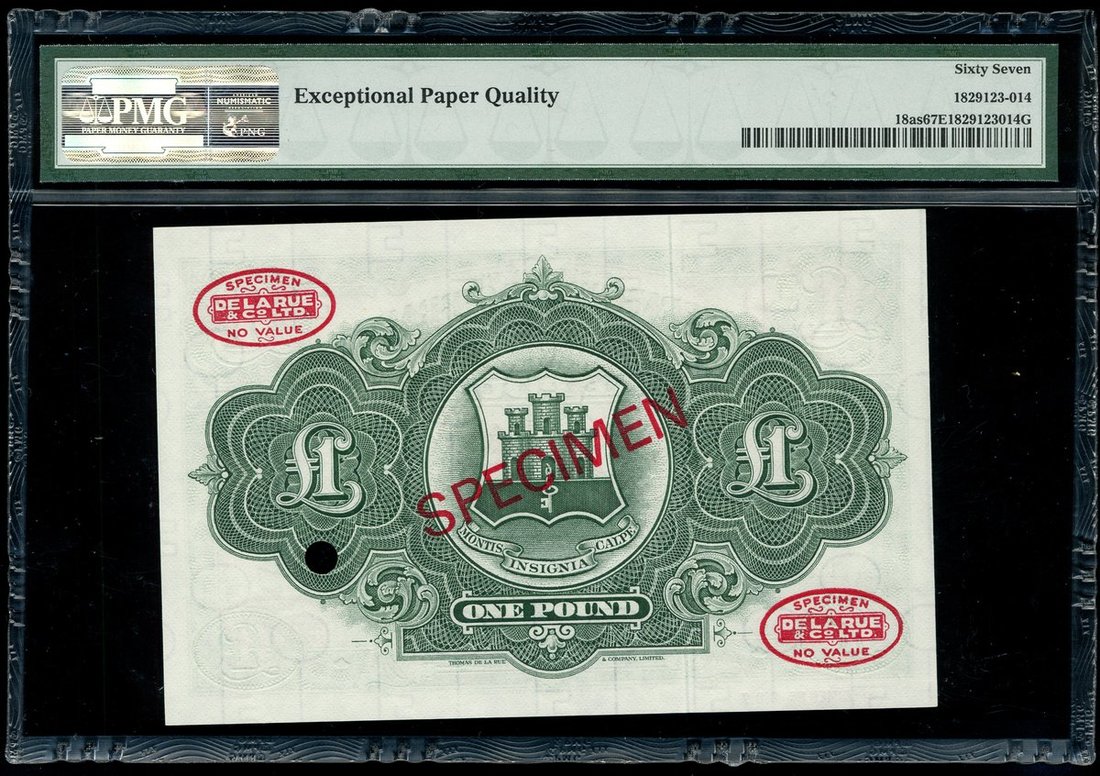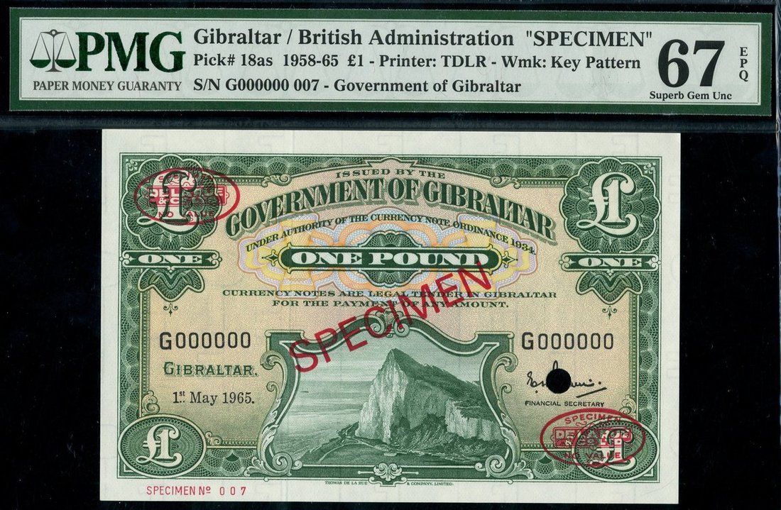 Government of Gibraltar, specimen £1, 1st May 1965, serial number G000000 007, (Pick 18as, TBB B116s), red oval DLR SPECIMEN and diagonal SPECIMEN overprint, cancelation punch hole, in PMG holder 67EPQ Superb Gem Uncirculated, very high grade