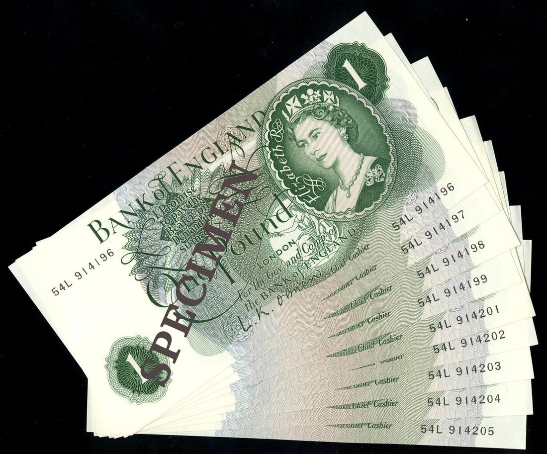 Bank of England, L. K. O'Brien, consecutive £1 (9), serial number 54L 914196-199, 54L914201-205, green, Queen Elizabeth II at right, reverse, Sir Isaac Newton,