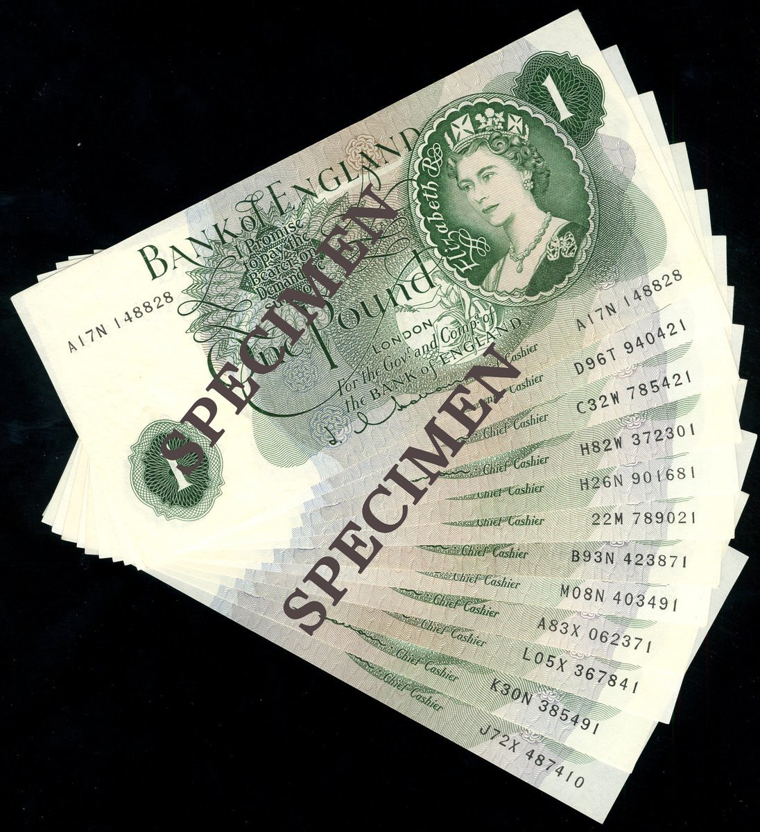 Bank of England, J Q Hollom, £1 (10), ND (1963), prefixes B93N,H26N,K30N,J72X,H82W,A83X,A17N,C32W,D96T,L05X, green, Elizabeth II at right, Britannia low centre right, also two replacement £1, prefix 22M and M08N