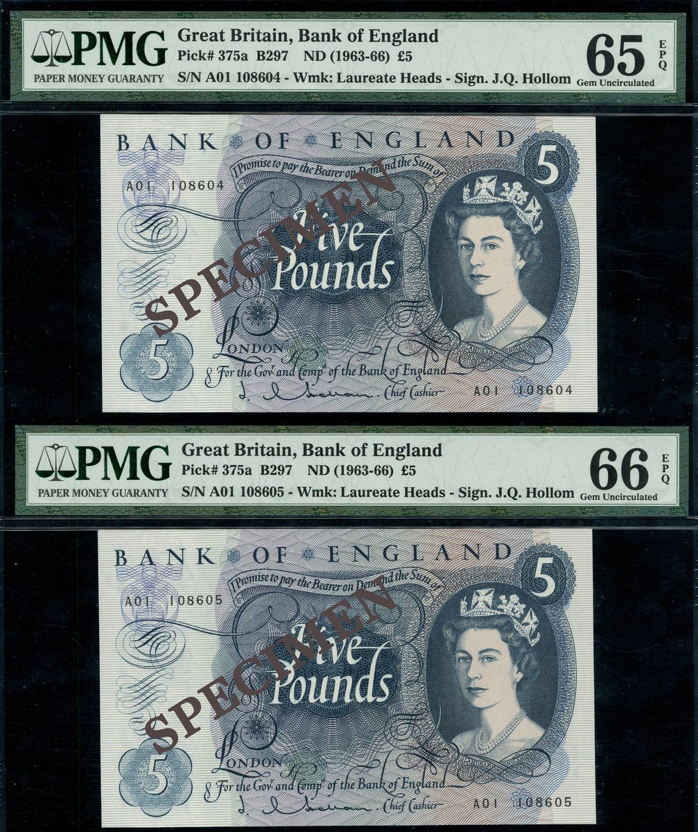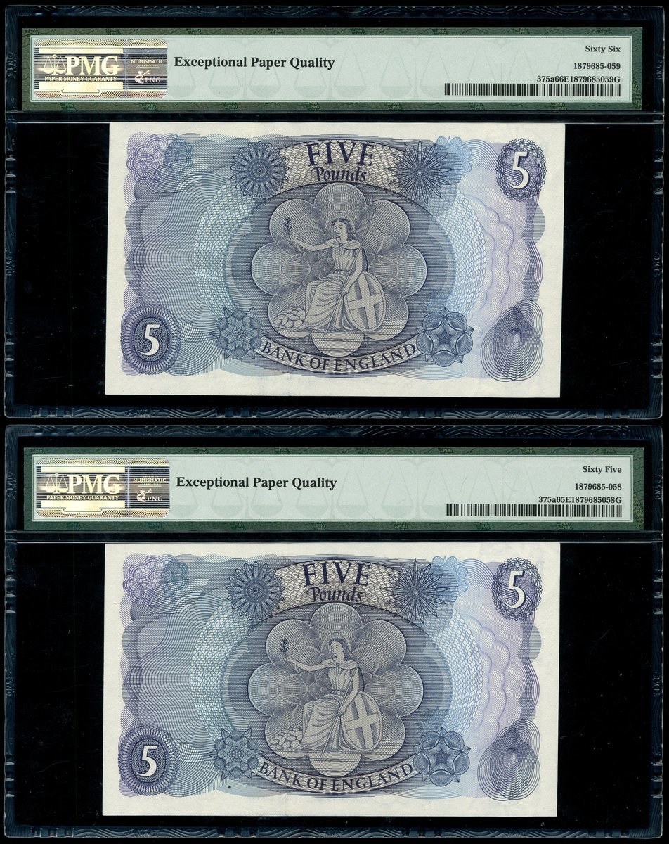 (x) Bank of England, J.Q. Hollom, consecutive pair of £5, ND (1963-66), serial number A01 108604/605, (EPM B297, Pick 375a), in PMG holders 65 EPQ, 66 EPQ gem uncirculated respectively, scarce first runs in high grade (2)