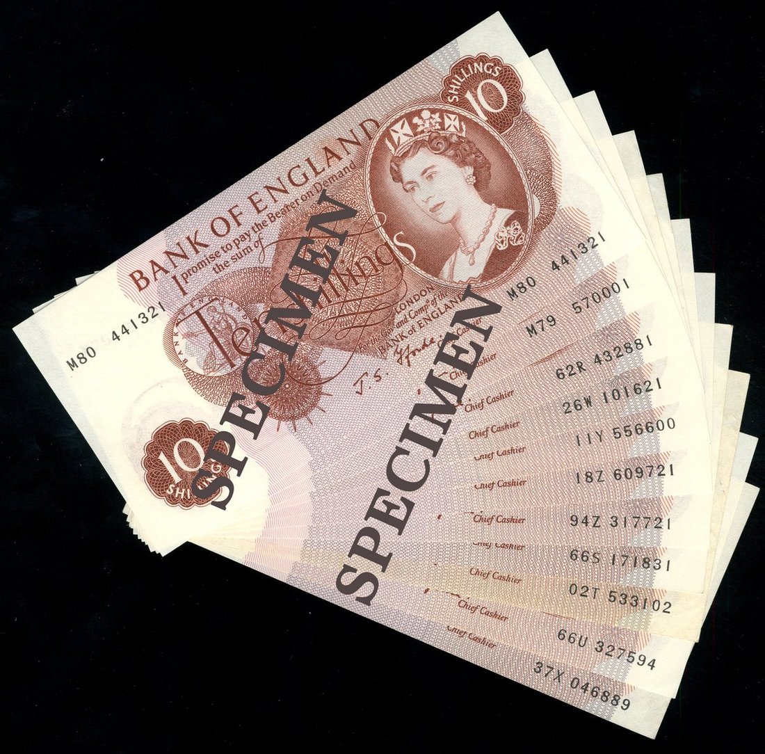 Bank of England, J S Fforde, 10 shillings (9), ND (1967), suffixes R, S, T, U, W, X, Y, Z (2), brown, portrait Elizabeth II at right, value and Britannia at centre, also two replacement notes with prefix M79 and M80