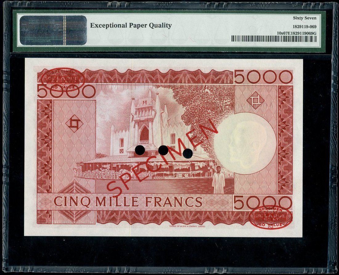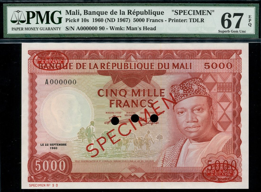 Banque Republique du Mali, specimen 5000 francs, 22 September 1960, serial number A000000 90, (Pick 10s, TBB B110as1), red oval DLR SPECIMEN and diagonal SPECIMEN overprint, cancelation punch holes, in PMG holder 67EPQ Superb Gem Uncirculated, very high grade