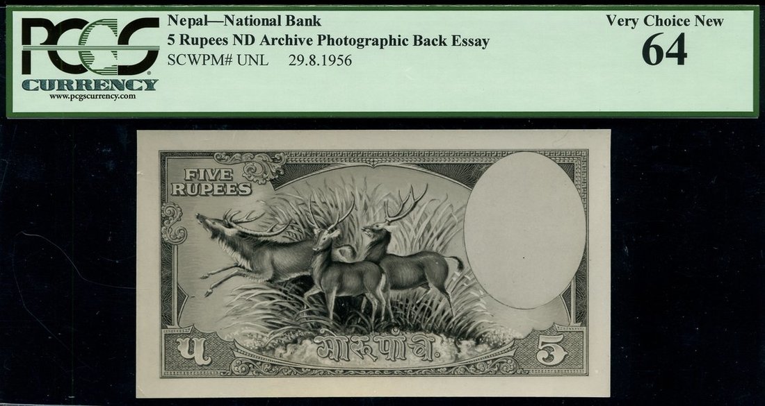 National Bank of Nepal, reverse archival photograph for an unissued 5 rupees, ND (1956), (Pick unlisted), 'DLR STUDIO PHOTOGRAPHED 29 AUG 1956' at reverse, in PCGS Currency holder 64 very choice new, rare