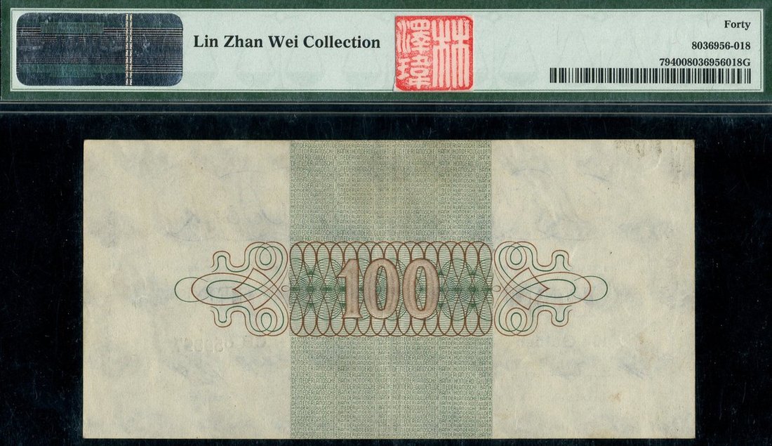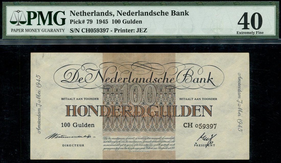 (x) Netherlands, Nederlandsche Bank, 100 Gulden, Amsterdam, 7th May 1945, serial number CH 059397, brown and black, value at centre, signatures at lower left and right, reverse, value at centre, patterns