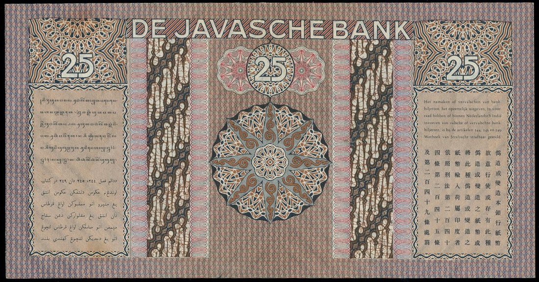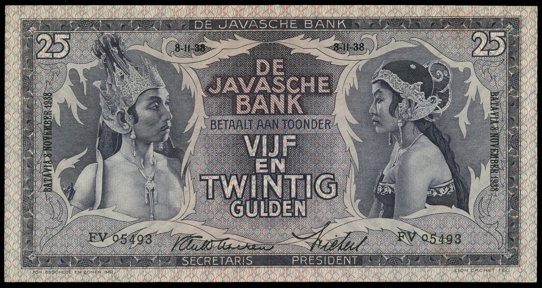 De Javasche Bank, 50 dollars, 8 November 1938, serial number FV 05493, dark blue/gray, Javanese dancers at left and right,
